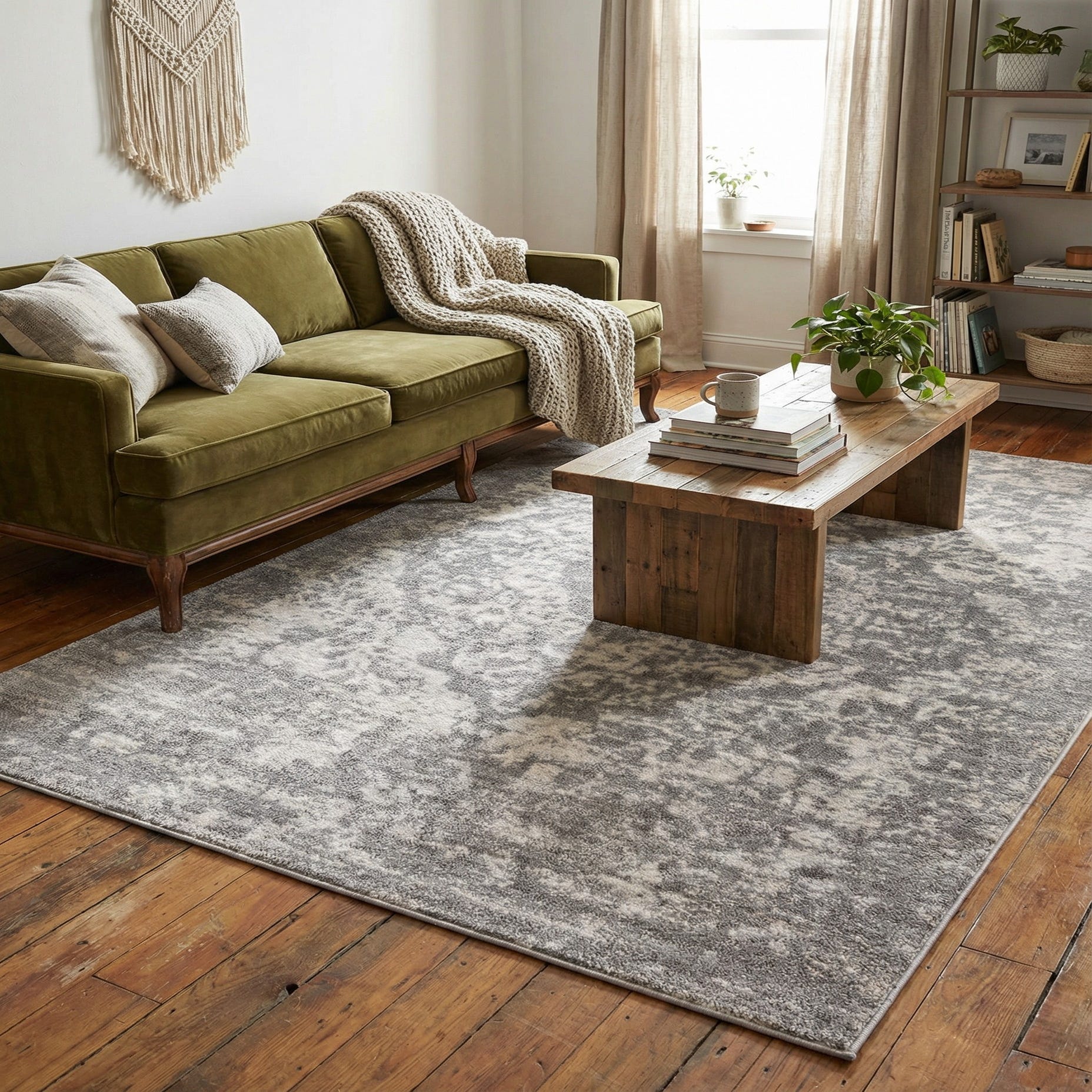 A low-profile rug with a softly worn medallion motif in ivory set against a gray ground, this piece blends traditional patterning with a relaxed, distressed finish. Machine-made from 85% polypropylene and 15% polyester, the surface feels soft to the touch with a smooth, slightly velvety finish and a subtle sheen that catches light without overpowering the room. The even construction keeps the pattern consistent across the field while the faded detailing adds visual depth and a lived-in character.