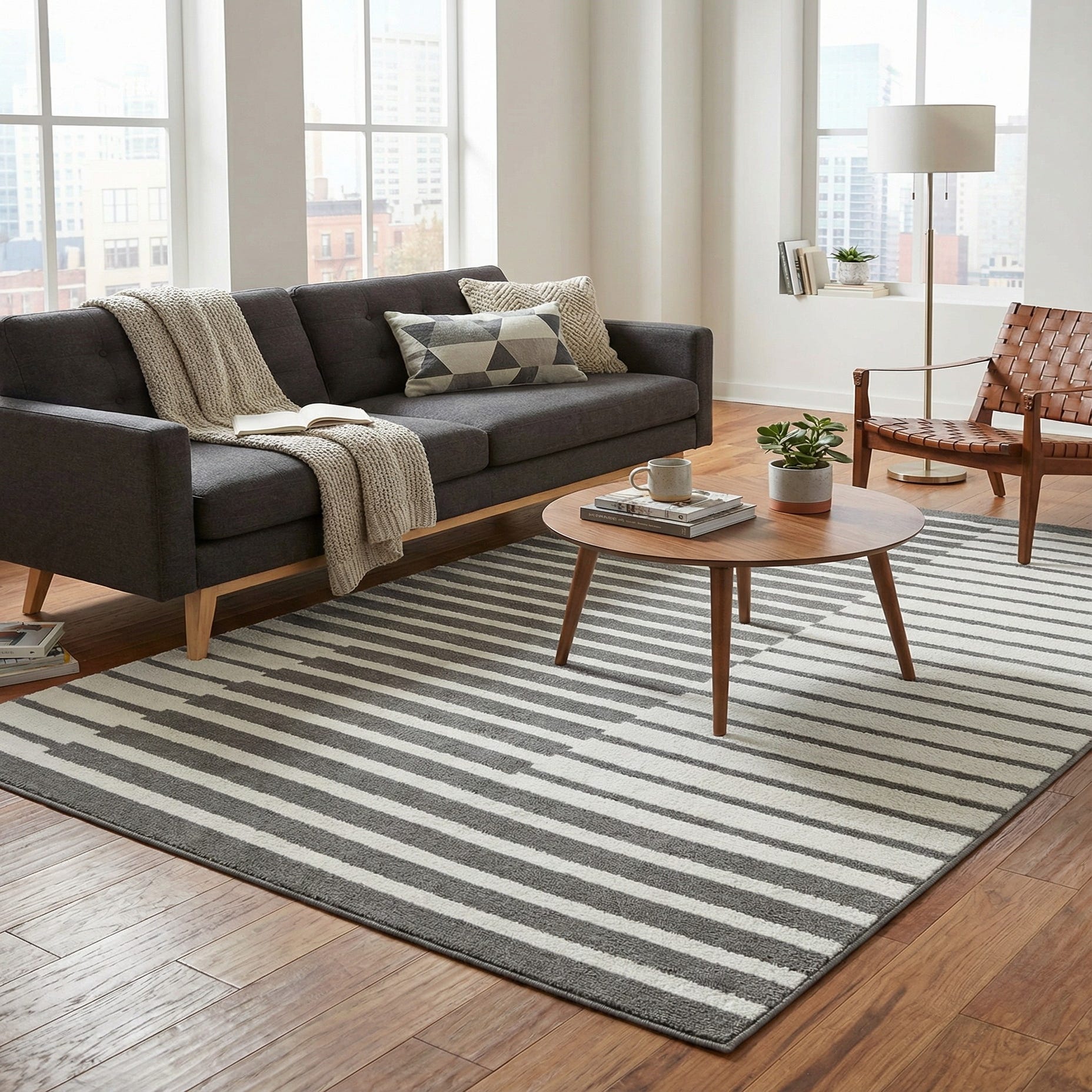 Machine-made from 100% polypropylene, the rug has a low-profile pile with a softly textured surface; the ivory bands sit slightly higher than the gray background, offering a gentle ribbed feel underfoot. It’s well suited to living rooms and home offices to define seating areas, under a dining table to ground a set of chairs, or in an entry where clean lines complement functional flow. Pair it with light wood furniture, matte black metal accents, or a muted neutral palette for a cohesive, modern interior.