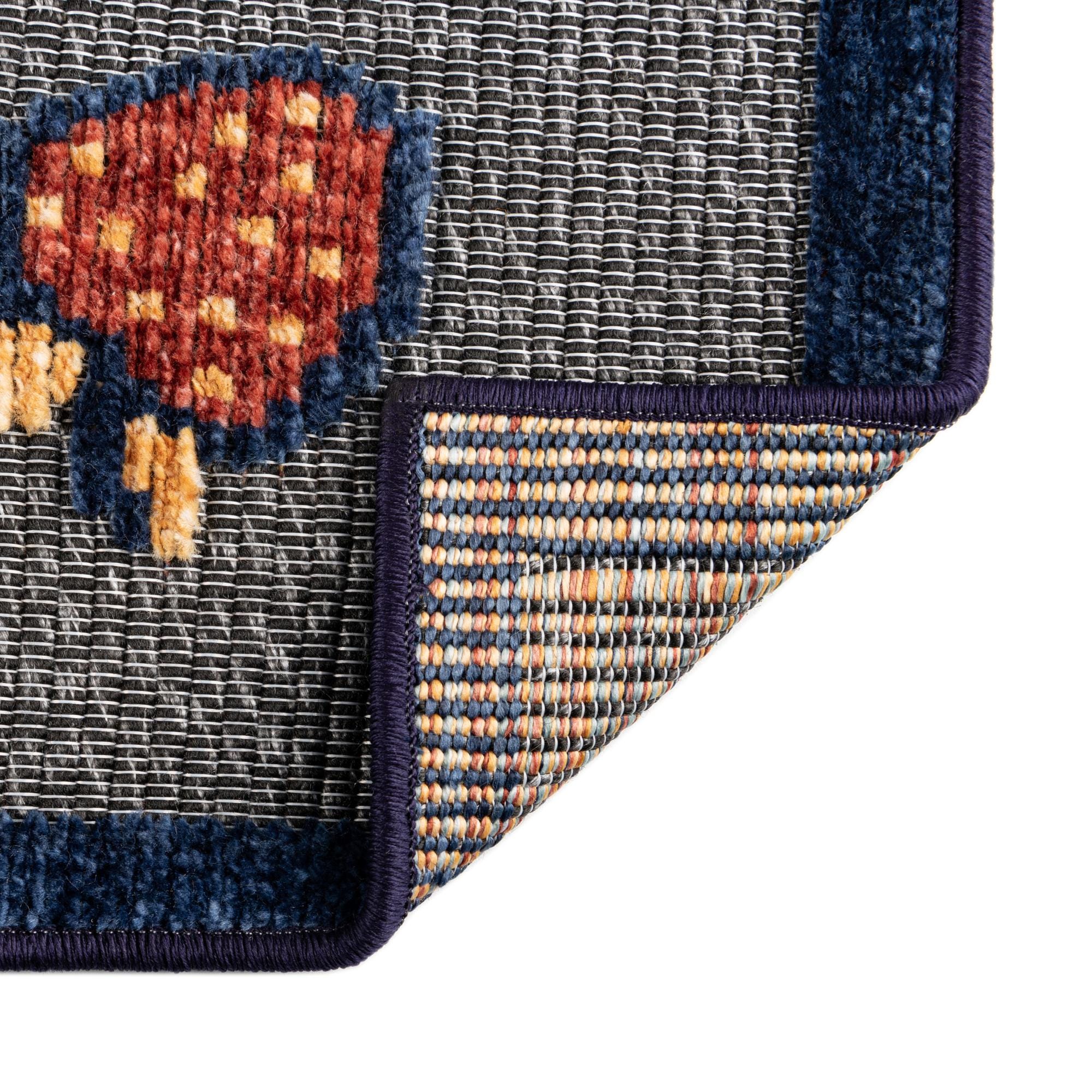 Primary color is Gray. Colors in this rug include: Gray, Light Blue, Navy Blue, Terracotta, Yellow.