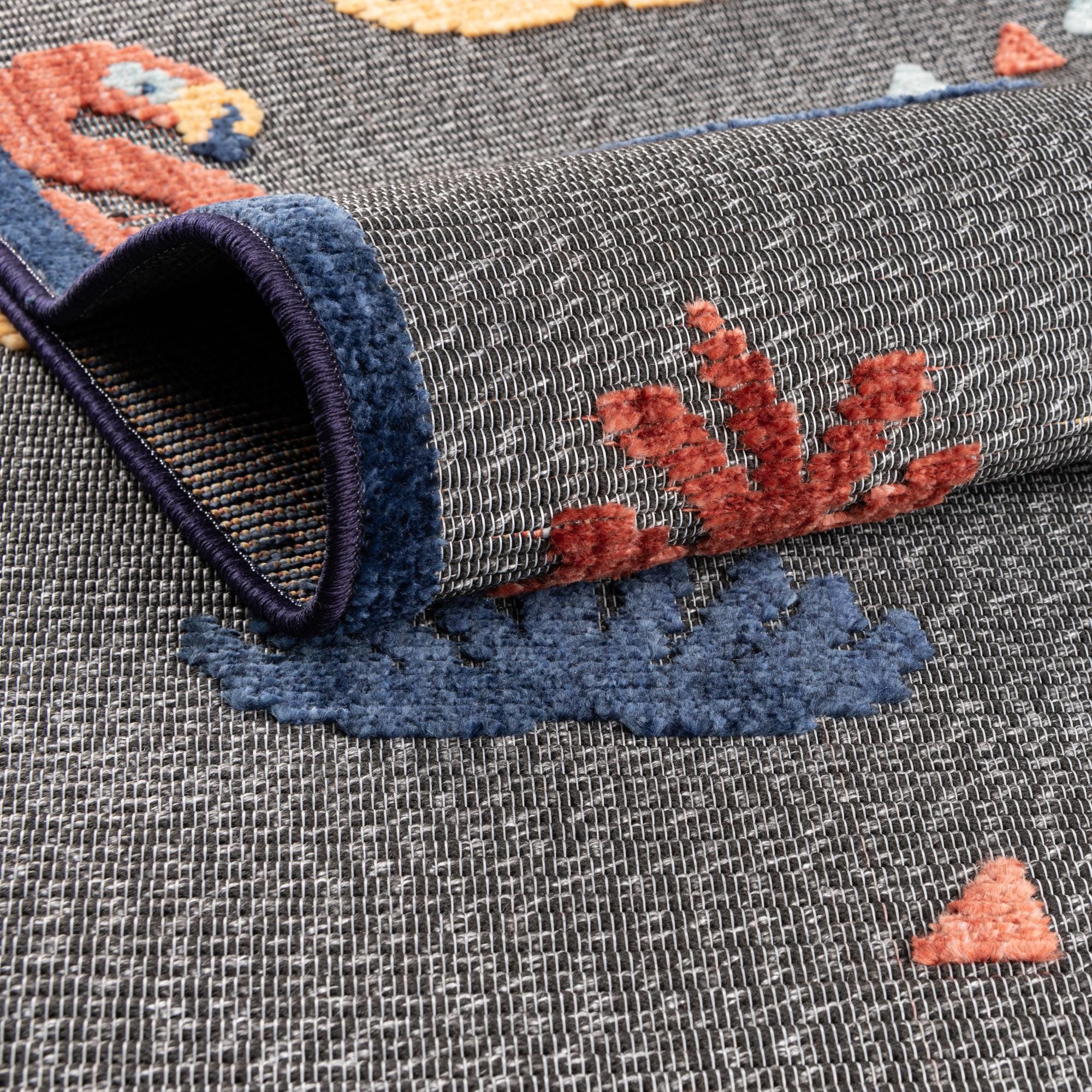 Primary color is Gray. Colors in this rug include: Gray, Blue, Navy Blue, Terracotta, Gold.