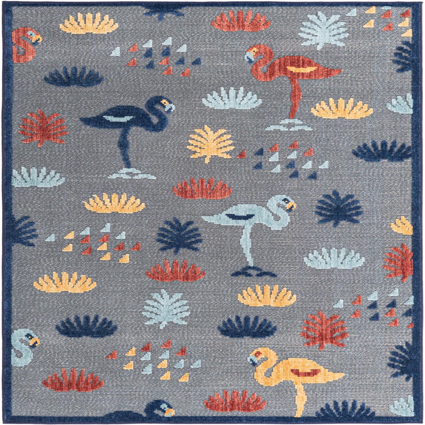 A 5x8 gray rectangular indoor/outdoor rug with a modern flamingo and coral pattern in blue, red, yellow, and light blue.