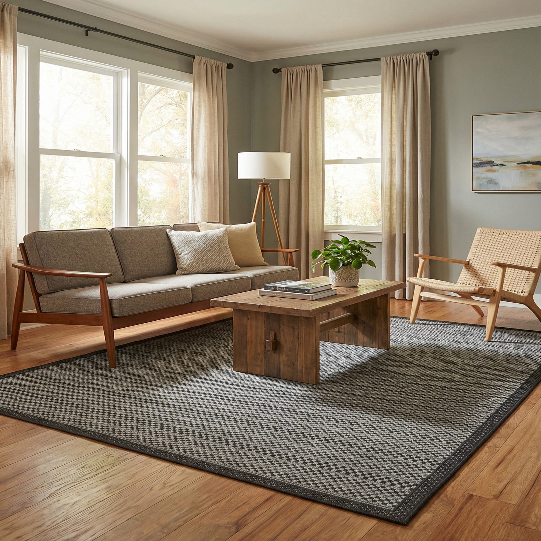 This rug works well on covered patios and sunrooms, paired with metal or wicker seating for a contemporary outdoor living area, and it translates easily inside to kitchens, entryways, or casual dining spaces where a low-profile anchor is needed. Use it to ground a monochrome living room, complement industrial or modern furnishings, or balance warm wood tones with its cool gray and silver palette.