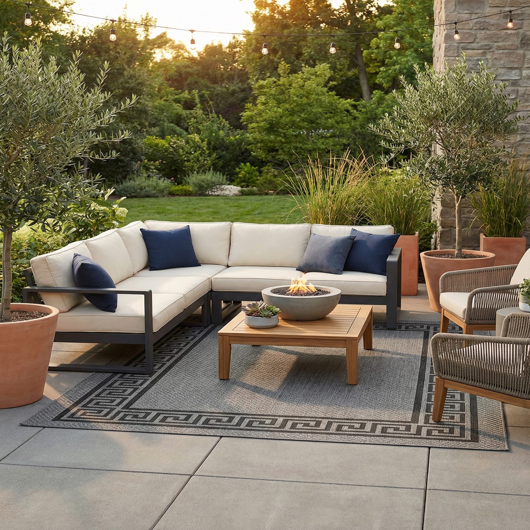 This piece works well on a covered patio, under an outdoor dining set, or inside in an entry, sunroom, or mudroom where a defined border helps anchor furniture. Pair it with charcoal or black-framed seating for a modern look, natural wicker and pale linens for a coastal vibe, or warm wood accents and potted greenery for a transitional outdoor-indoor space. The neutral gray field and bold border make it easy to layer with patterned cushions or solid outdoor furnishings.