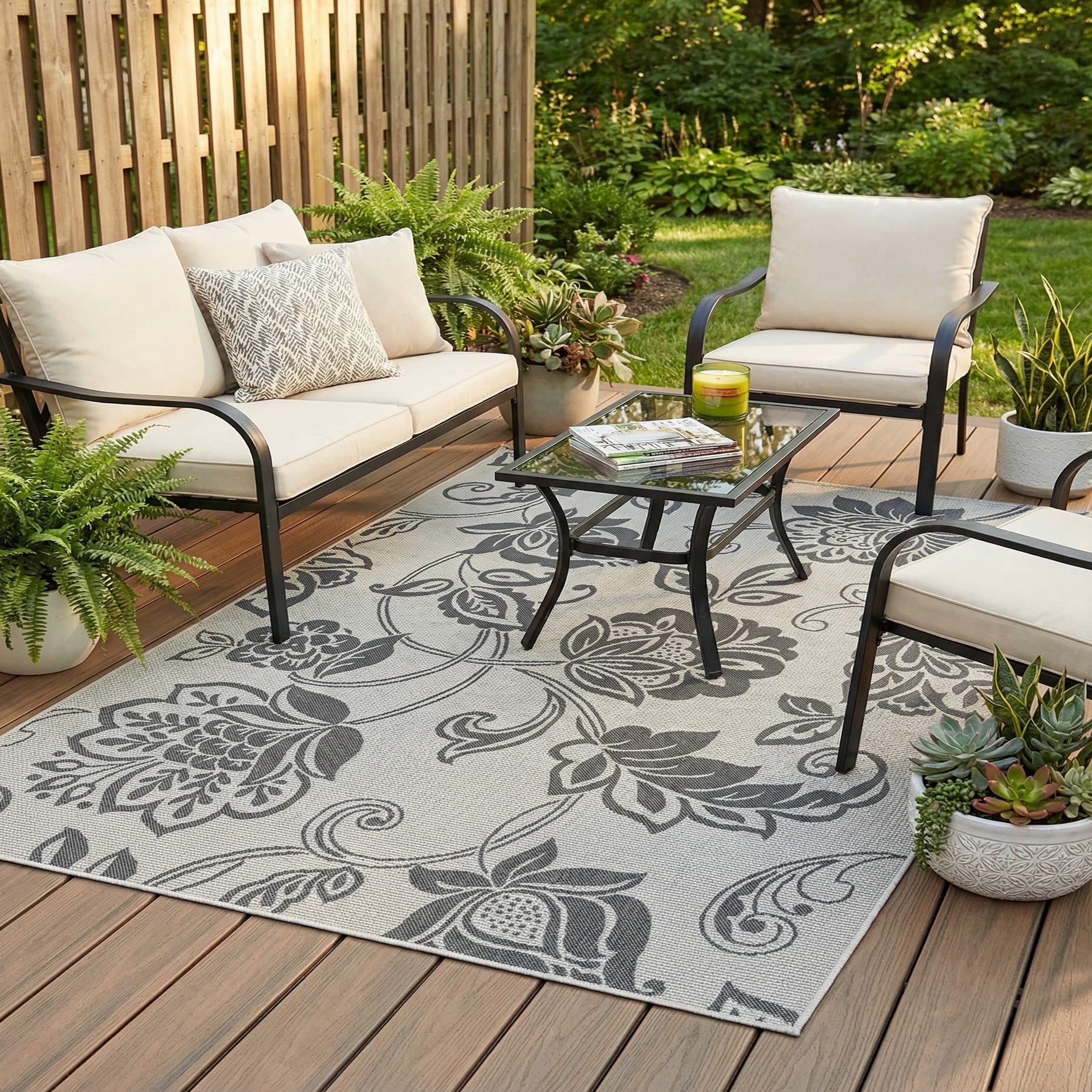 Machine-made from 100% polypropylene, this piece is suited to both indoor and covered-outdoor settings where a durable, easy-to-place rug is needed. It pairs naturally with neutral upholstery and cool-metal accents — think charcoal sofas, white-washed patio furniture, or a teak outdoor dining set — and works well in a contemporary living room, a sunroom, a sheltered patio, or an entryway that benefits from a calm, botanical touch.