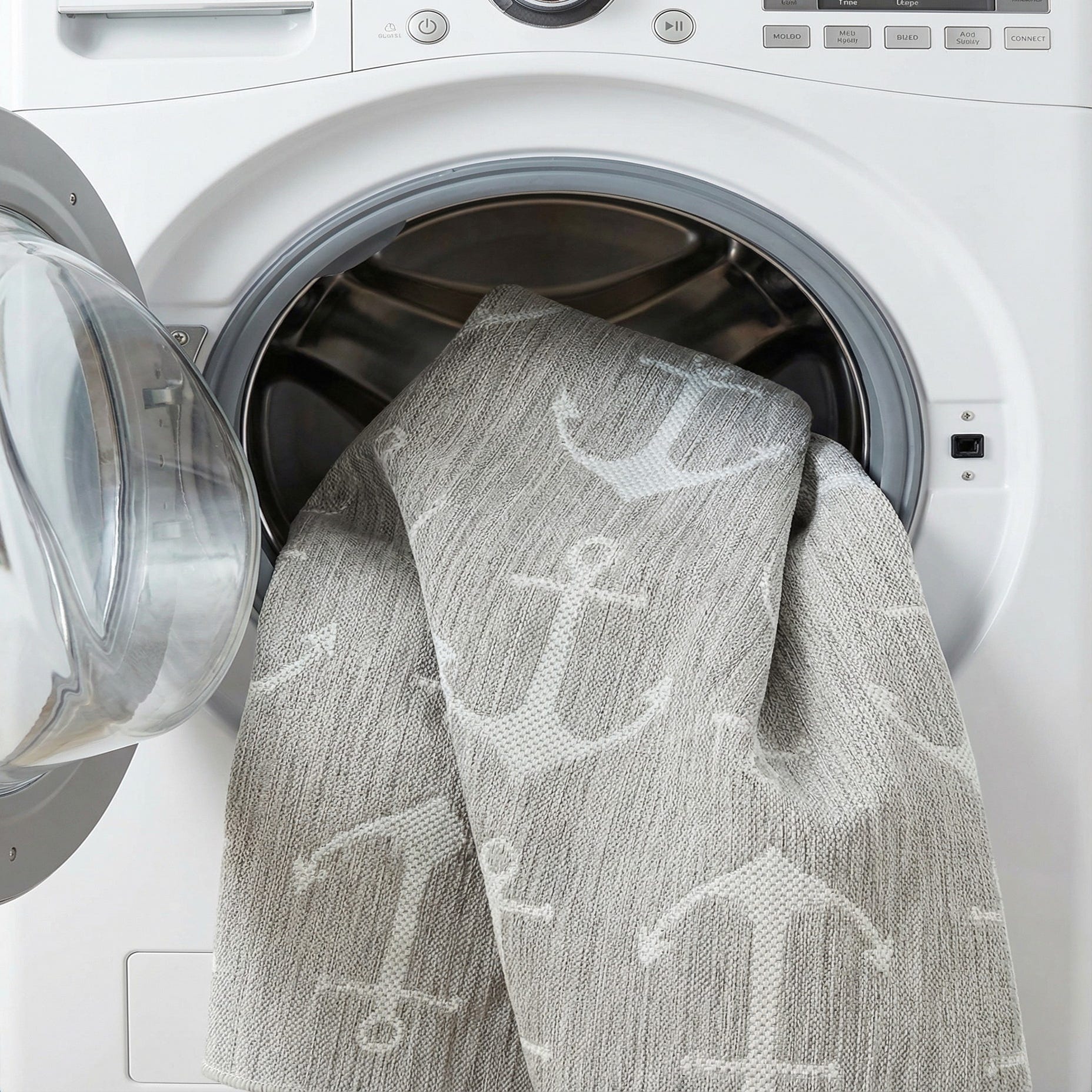 A rectangular 5x8 gray indoor/outdoor rug with a repeating pattern of white anchors, perfect for a coastal-themed patio or living room.