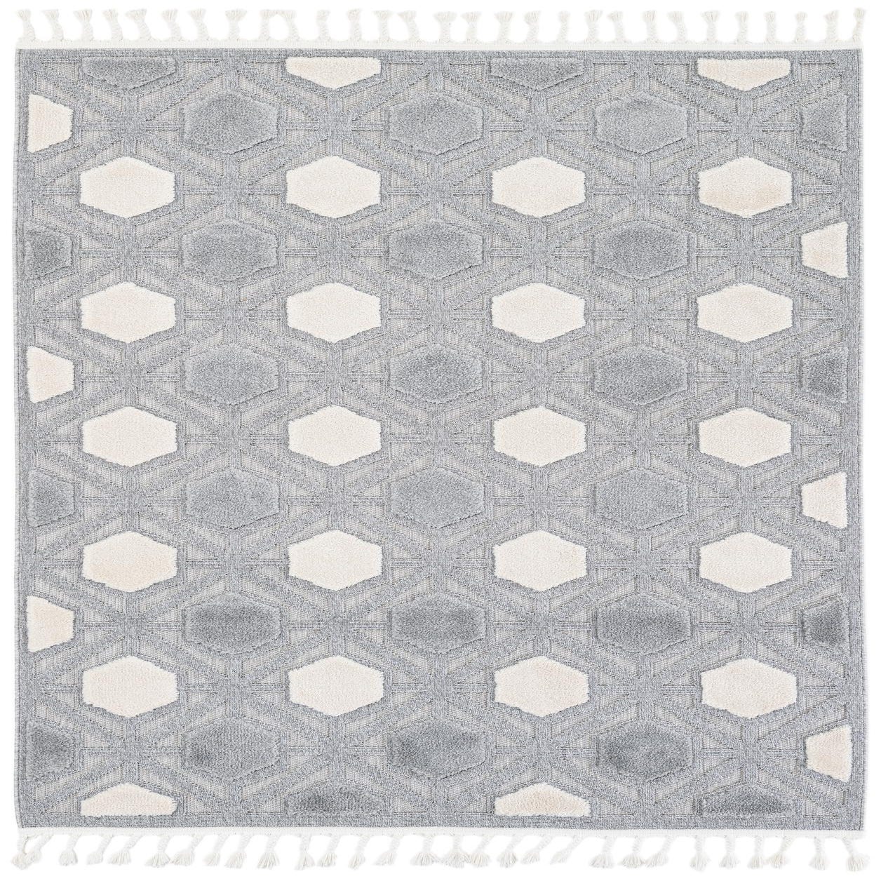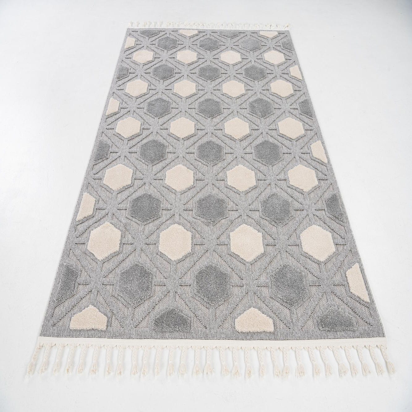 A 5x8 rectangular gray modern rug with a geometric pattern of light and dark gray hexagons, suitable for indoor or outdoor use.