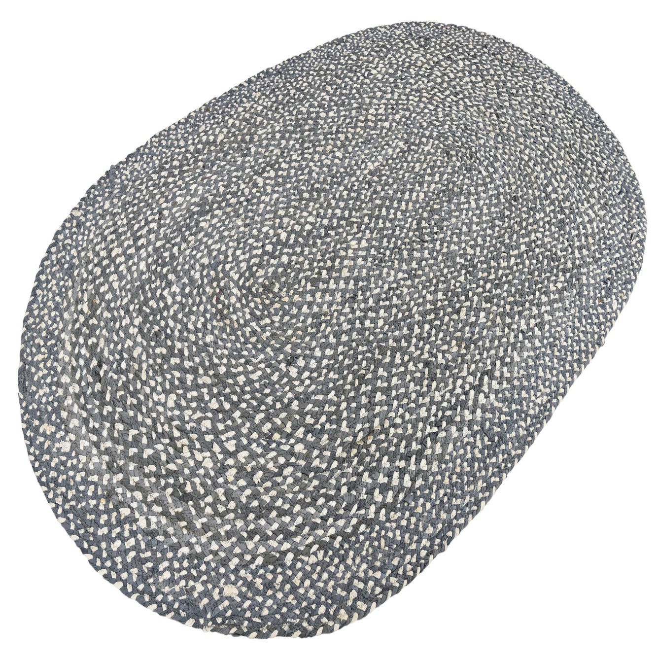 Hand-braided from 100% cotton, this oval rug brings a tactile, woven surface with a low, textured profile. The braided coils form concentric rings that create a subtle, speckled pattern—ivory fibers threaded through a gray background for a balanced, two-tone look. The cotton braid feels soft underfoot while retaining a sturdy hand that lays flat and adds visual depth without bulk.