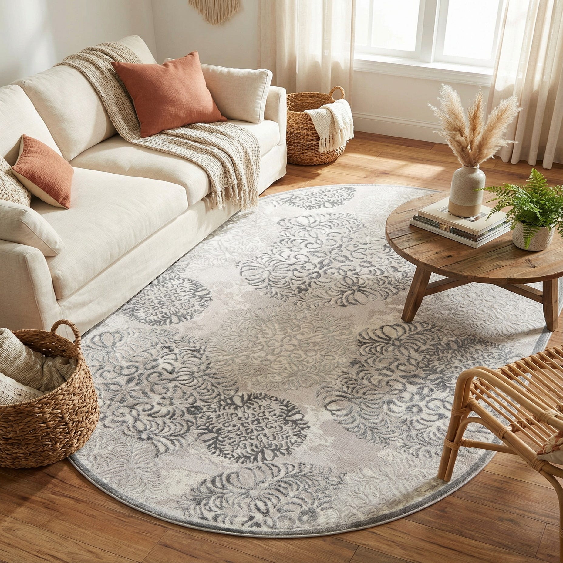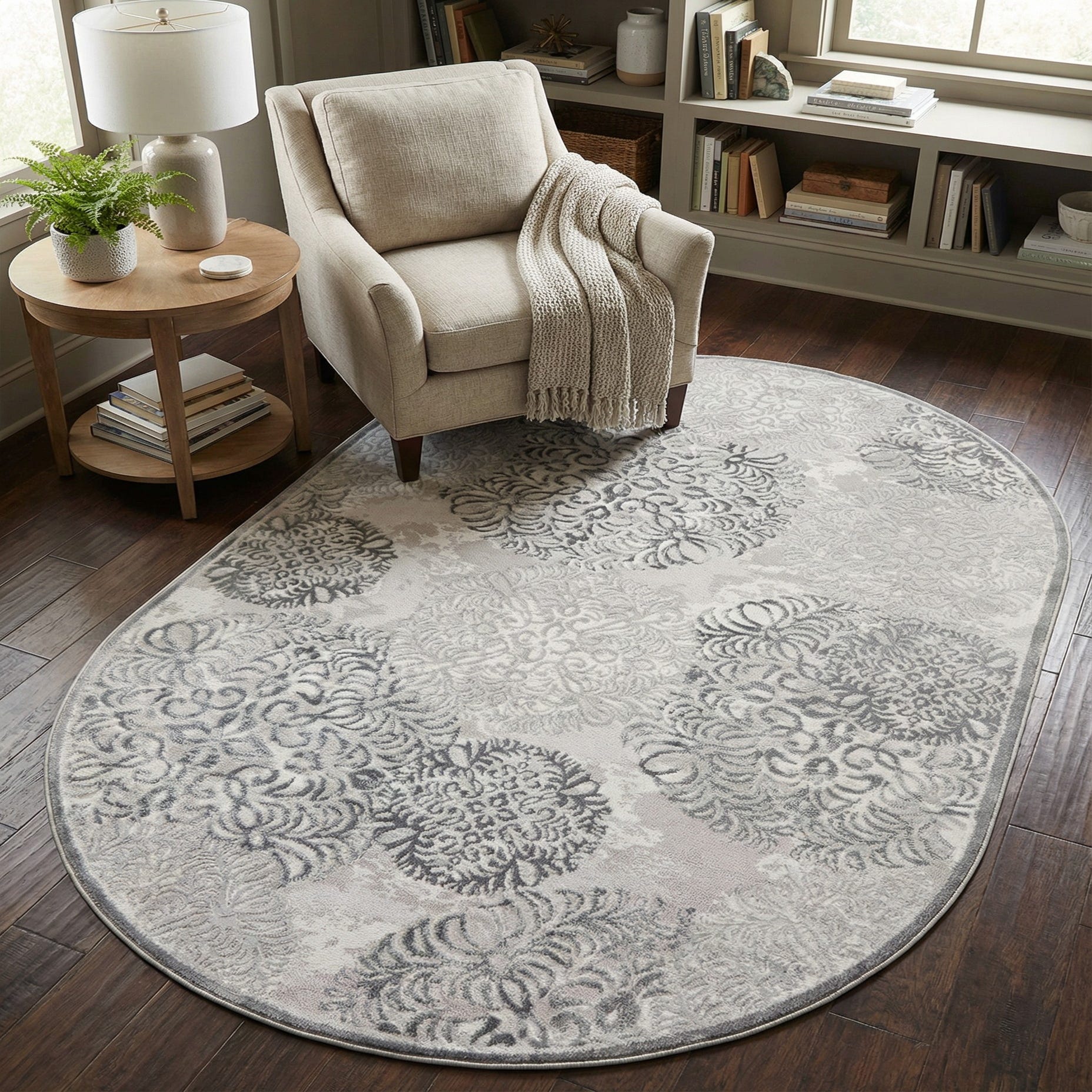 The oval silhouette fits well in narrower entryways, at the foot of a bed, or beneath a round dining table for a balanced, inviting arrangement. Its neutral gray base and ivory-beige accents work equally well with contemporary transitional interiors, soft modern schemes, or farmhouse and coastal palettes—pair with light wood furniture, muted linens, and mixed-metal accents to emphasize texture and warmth.