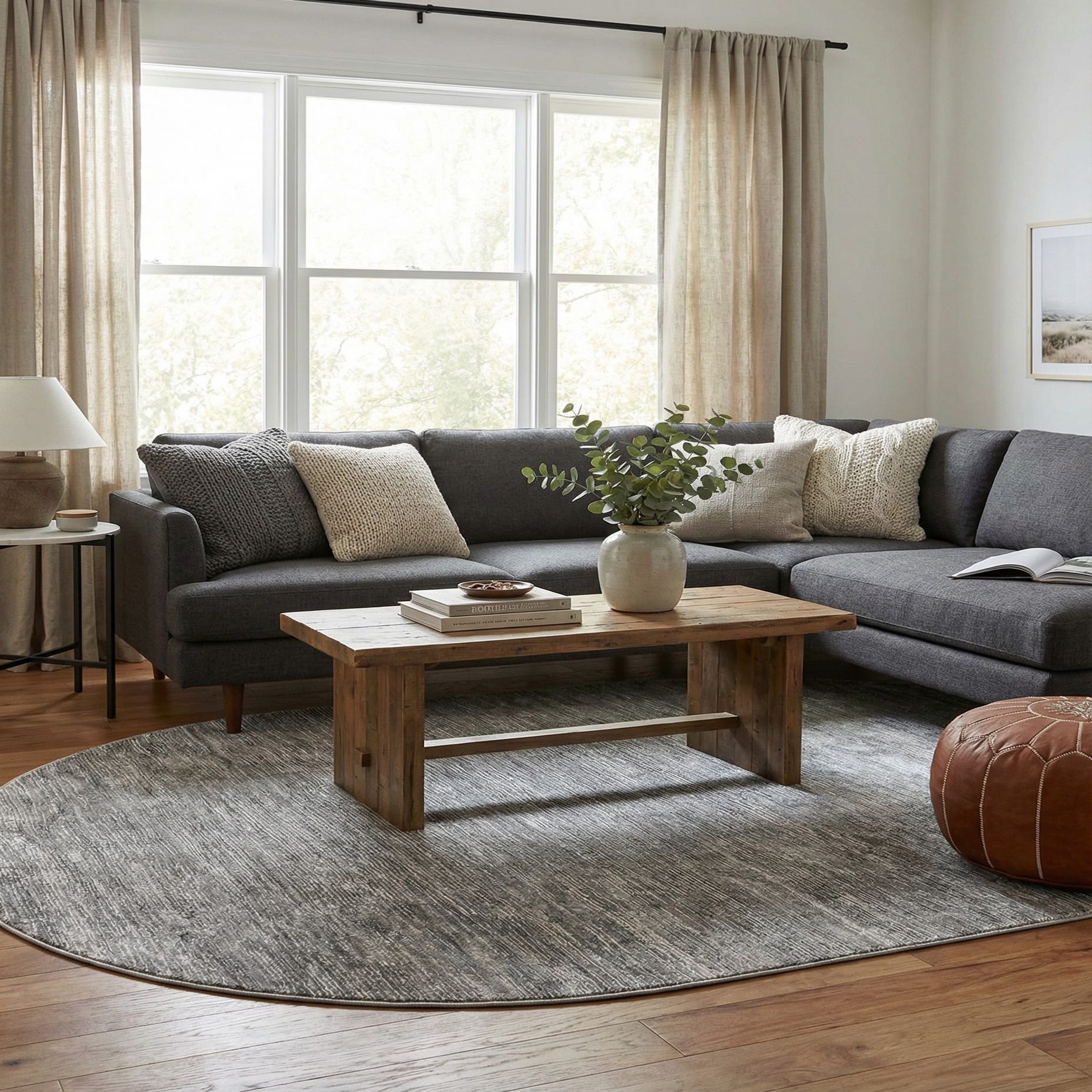 A 5'3" x 8'0" oval gray area rug with a subtle textured, high-low pile, suitable for modern indoor spaces.