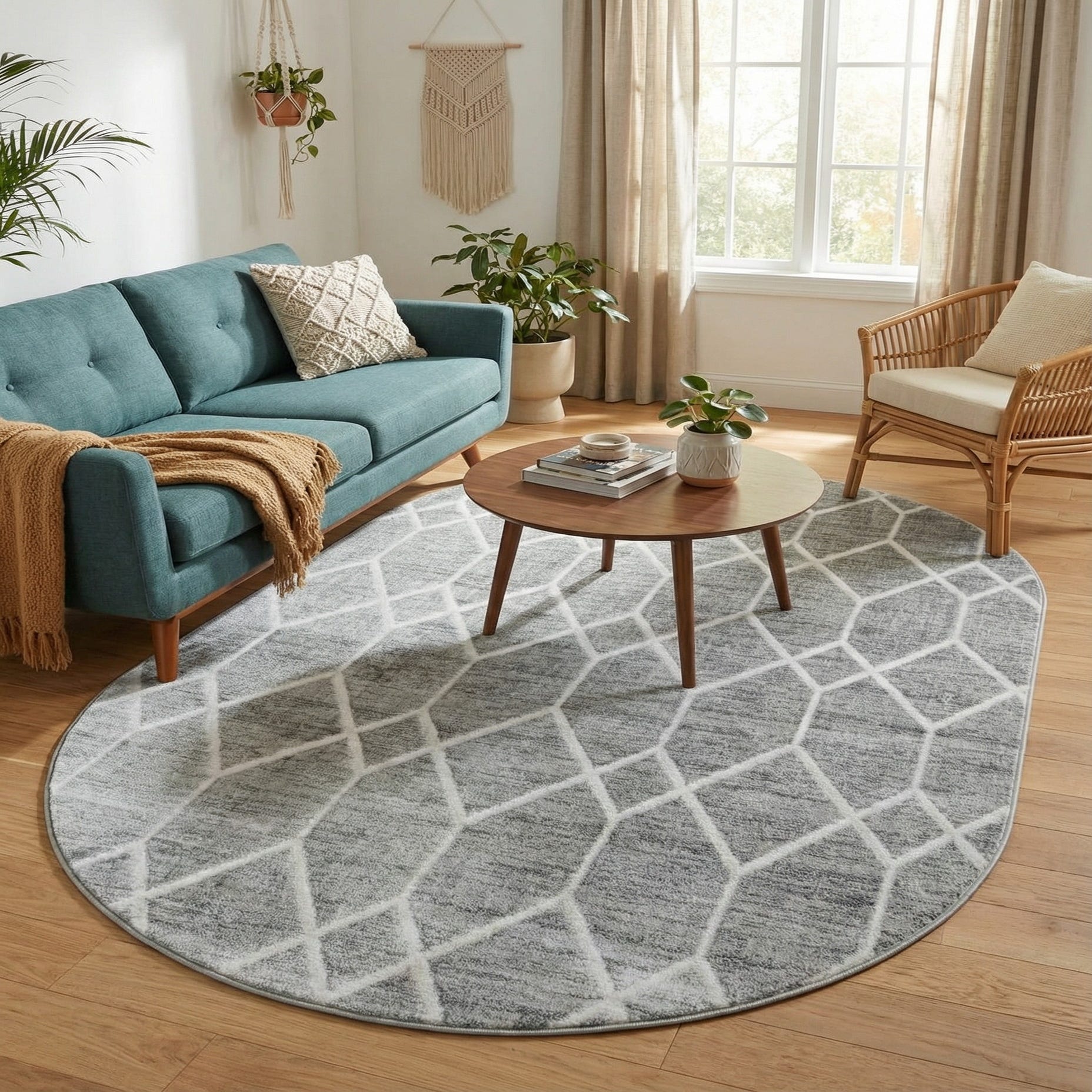 A crisp ivory lattice draws a clean geometric pattern across a textured gray ground, forming elongated hexagons and diamond motifs that give the surface a structured, modern look. The oval silhouette softens the geometry, making the design feel balanced and approachable while the contrast between the ivory lines and the muted gray background keeps the palette neutral and versatile.