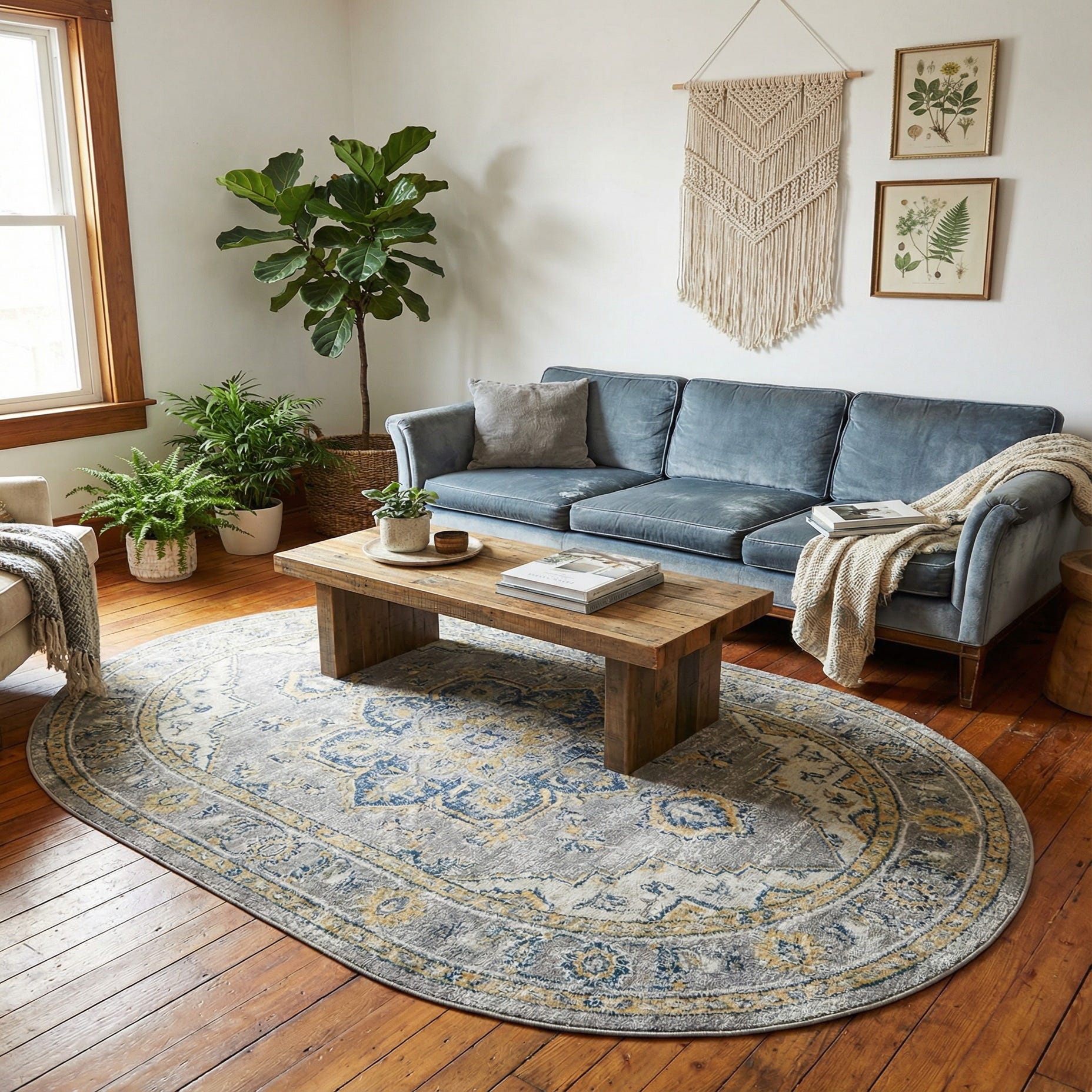 This rug fits well in transitional, coastal, or modern farmhouse settings and will warm up neutral living rooms, entryways, or dining nooks. Use it to anchor a seating group, beneath a round dining table, or at the foot of a bed; its oval silhouette and soft color story pair nicely with pale woods, navy or denim blues, crisp ivory upholstery, and brass or matte black accents.