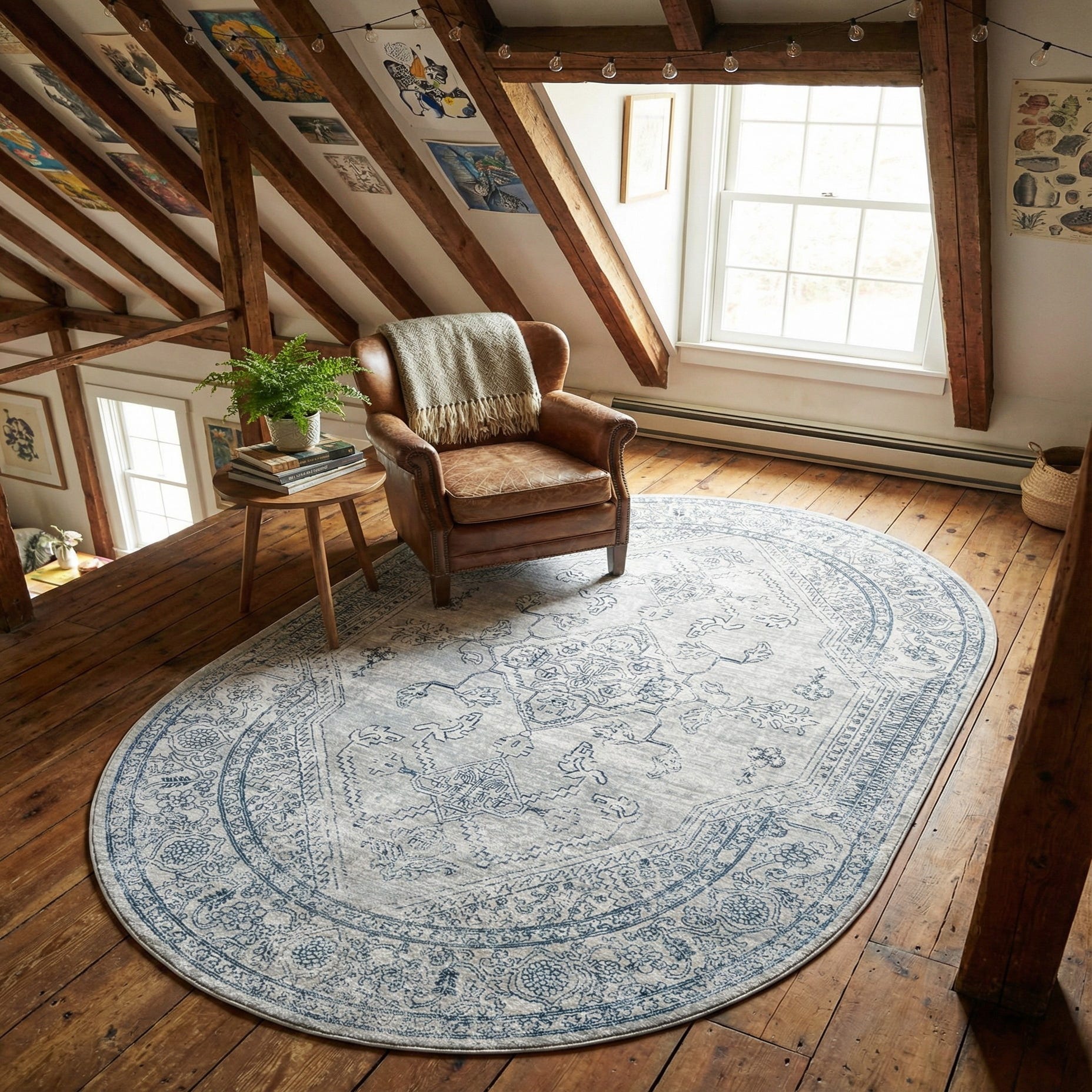 The oval shape fits beautifully beneath an oval or round dining table, or layered in a seating area to soften straight-lined furniture. Its cool gray and ivory palette pairs easily with light wood finishes, white or navy upholstery, and transitional or coastal interiors. Use it to add quiet pattern to a modern living room, bring softness to a farmhouse bedroom, or anchor an entryway with a refined, lived-in look.