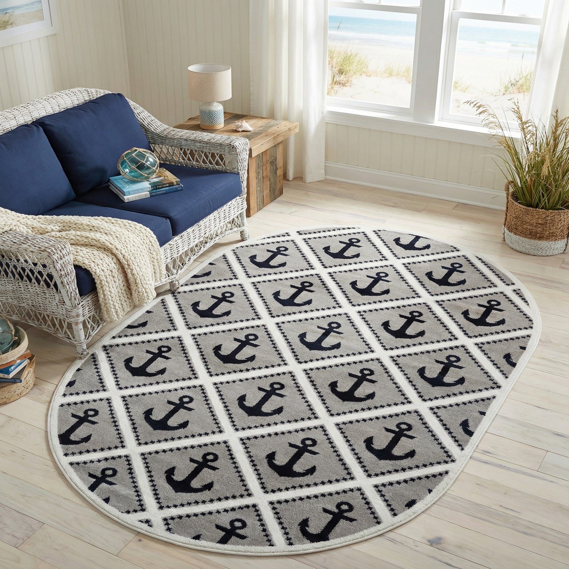 A crisp diamond lattice of ivory frames repeating navy anchors across a soft gray ground, giving this oval rug a clean, nautical look. The anchors are rendered in deep navy, their edges defined against the ivory trellis, while the gray background provides a neutral, calming base. Run your hand across the surface and you’ll notice a low, slightly dense pile with a smooth, even feel — soft underfoot but with enough structure to hold the geometric motif clearly.