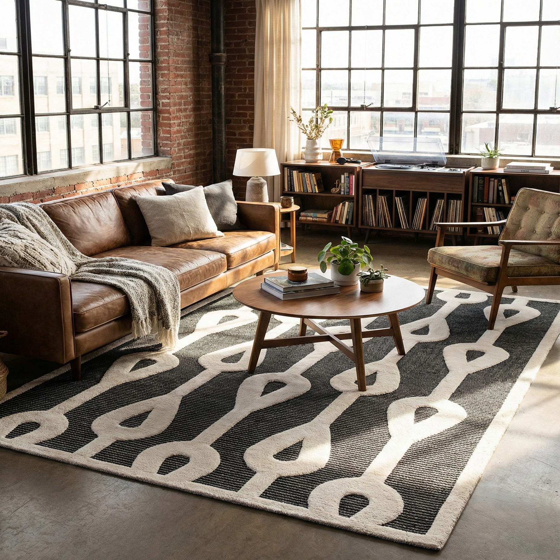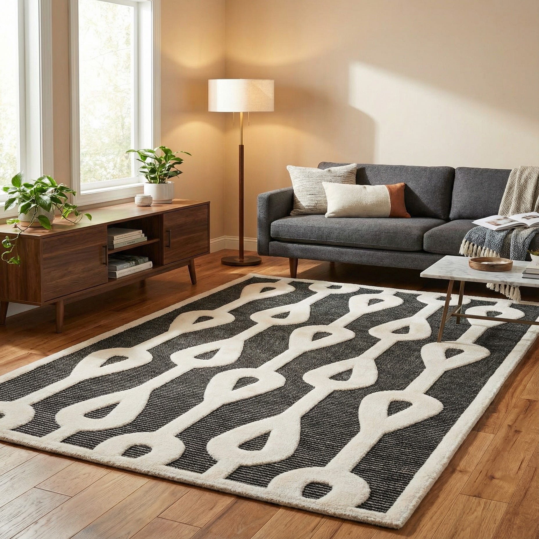 A 5x8 rectangular gray and white area rug with a bold, repeating chain-link pattern, offering a modern look.