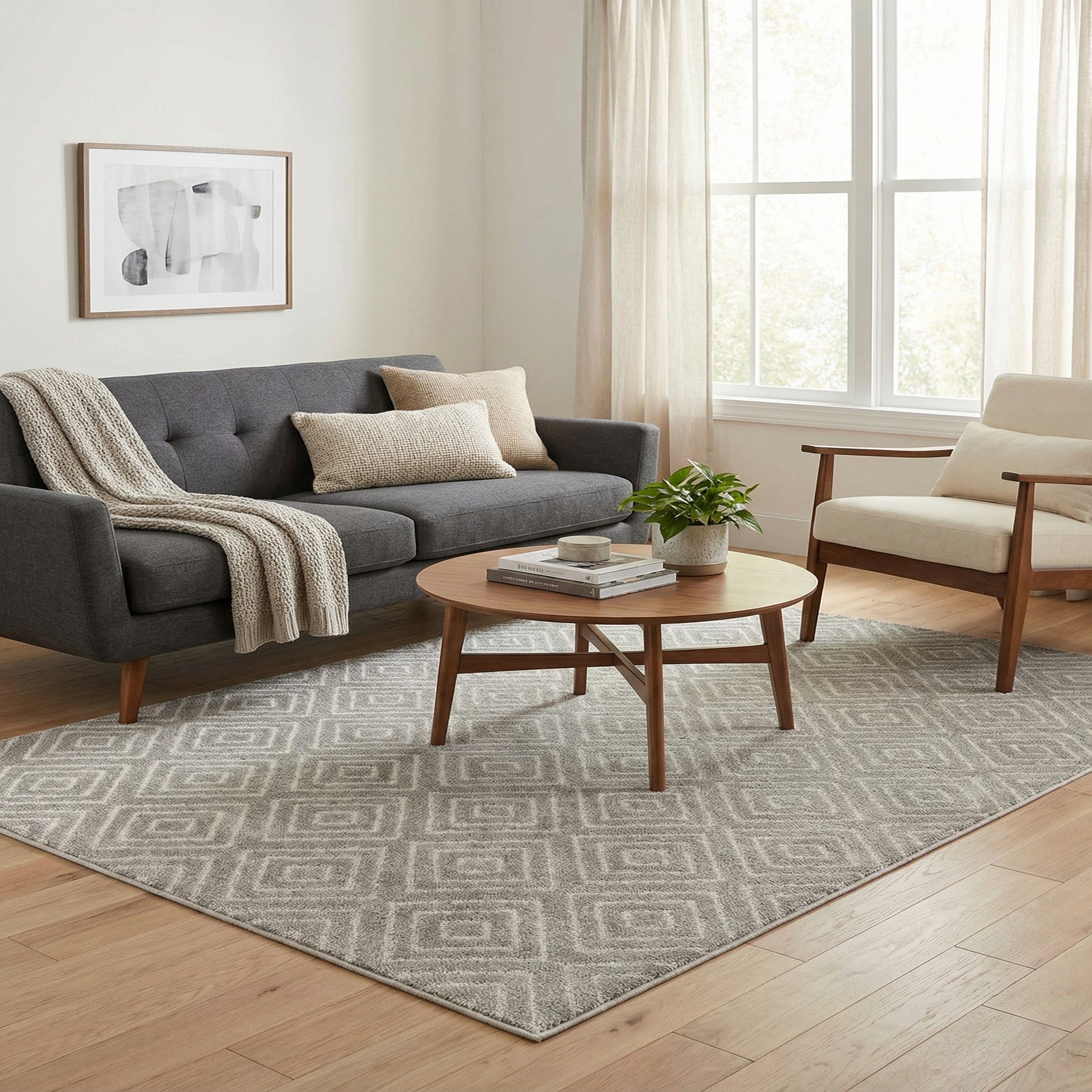 A 5x8 rectangular gray modern rug with a repeating diamond pattern, suitable for indoor or outdoor use.