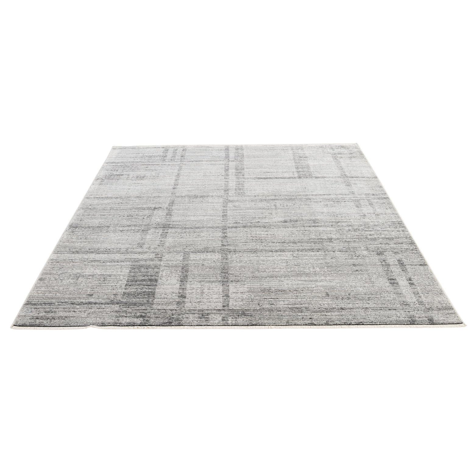 A 5x8 rectangular gray modern area rug with a subtle distressed abstract grid pattern, suitable for a living room.