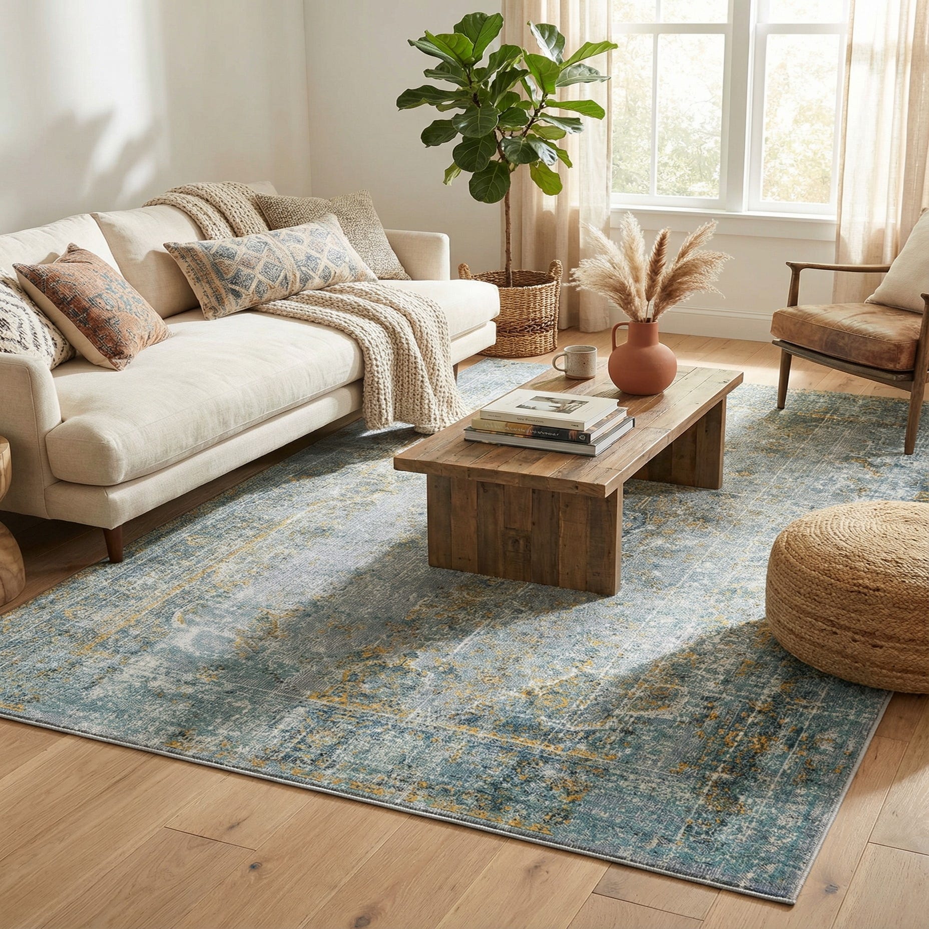 This rug works well as an anchor in a living room under a coffee table, beneath a bed to soften a bedroom, or in a home office to introduce color without overwhelming the space. It pairs naturally with light or medium wood tones, linen upholstery, and metal accents in brass or aged nickel; it also complements deeper navy or teal furniture to echo the rug’s blue notes while the yellow accents brighten the overall palette. The overall look suits transitional, coastal, and modern farmhouse interiors where a relaxed, layered aesthetic is desired.