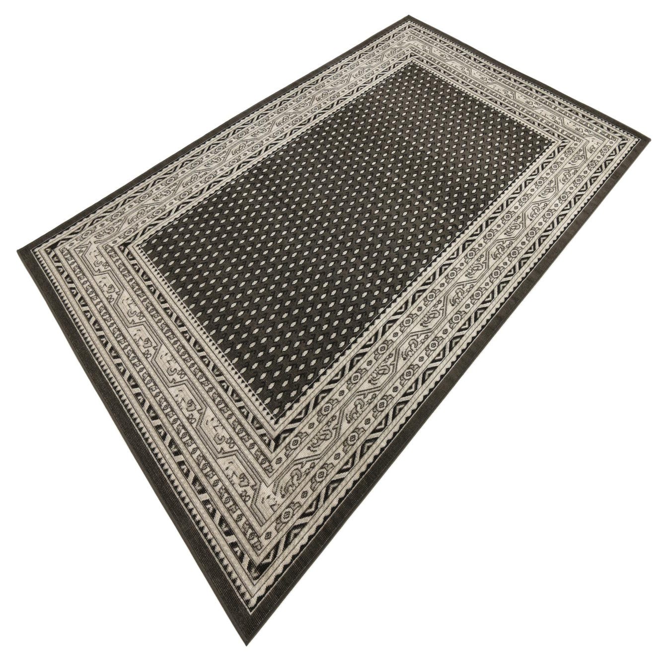 Place it in a neutral living room to anchor a seating group with warm beige sofas and black metal accents, or layer it under a wood dining table to add pattern without competing with other finishes. It also works well in a home office or entryway where durable, low-pile performance and a timeless palette—gray, beige, black and ivory—support a pulled-together aesthetic.