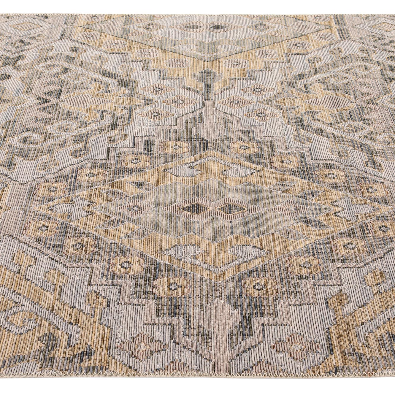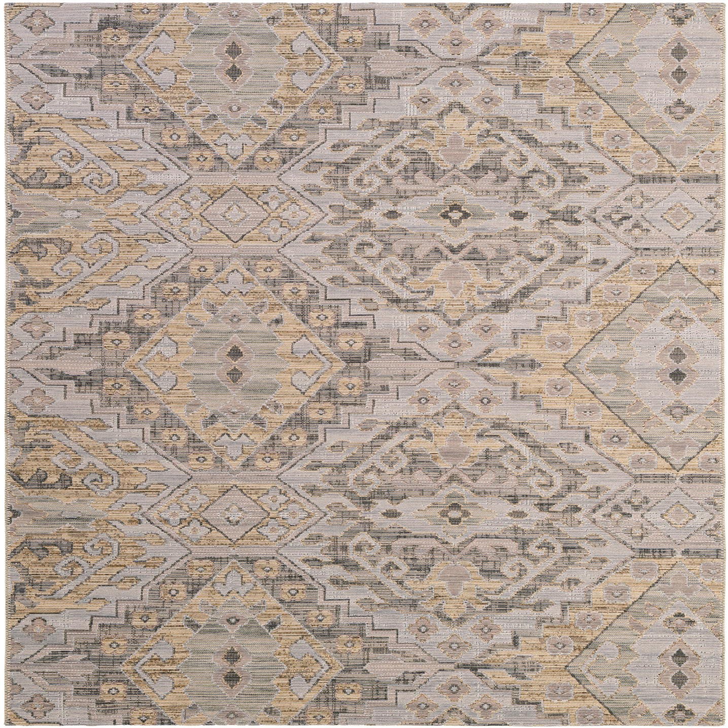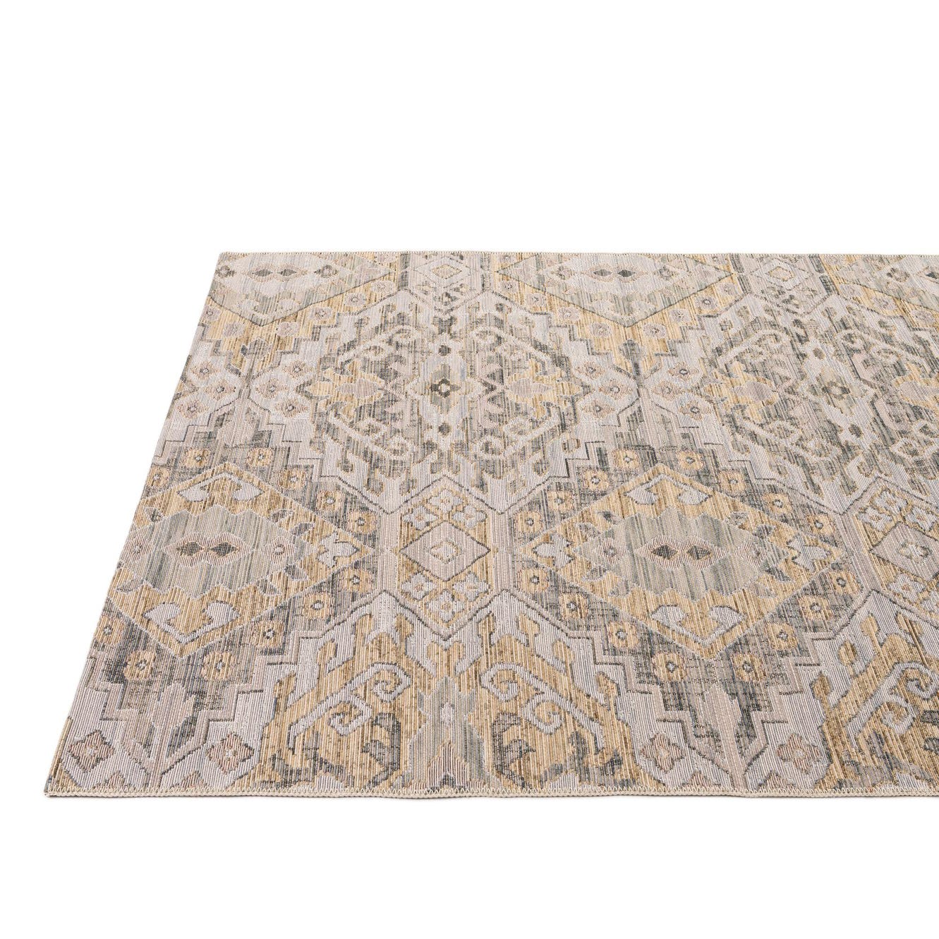 Primary color is Gray. Colors in this rug include: Gray, Beige, Ivory, Yellow.