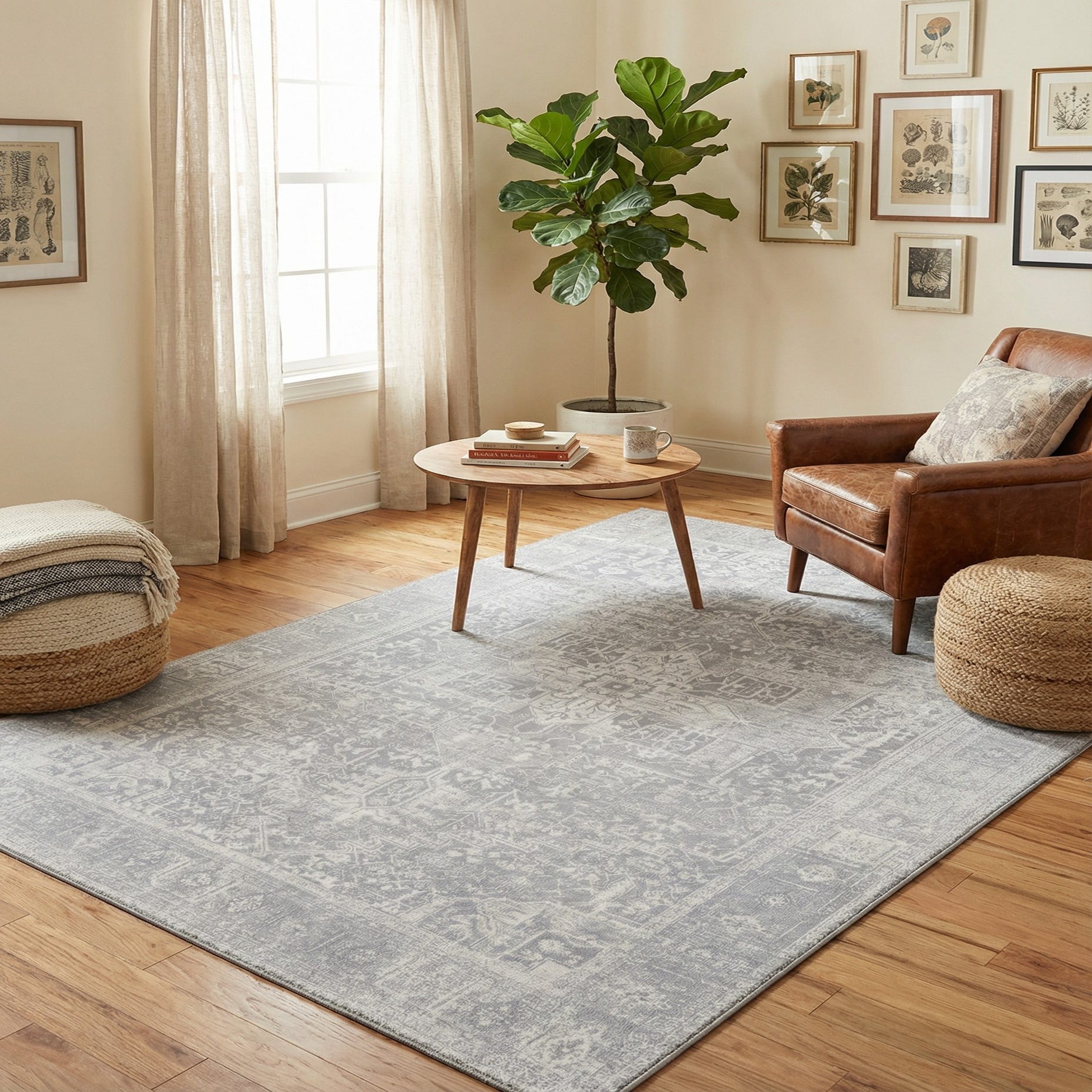A 5x8 rectangular gray area rug with a faded transitional oriental medallion pattern, suitable for a living room.