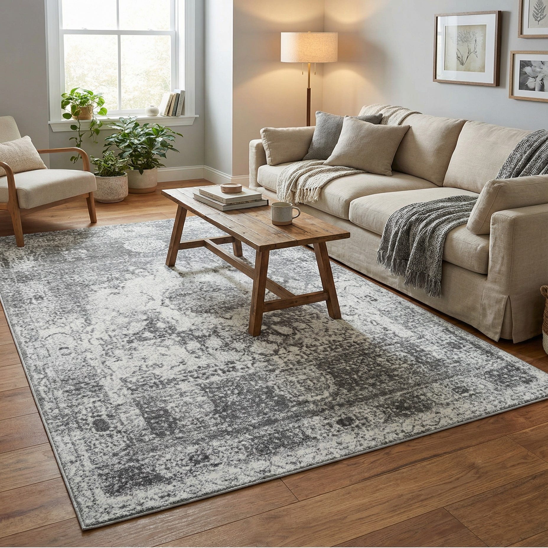 Machine-made of 100% polypropylene, the rug has a low, smooth pile that feels slightly dense underfoot and lays flat for easy furniture placement. Its neutral gray and ivory palette works well in a range of interiors: place it beneath a contemporary sofa and glass coffee table in a living room, anchor a muted bedroom with light linens and natural wood tones, or tuck it under a compact dining set in an open-plan space to tie the scheme together.