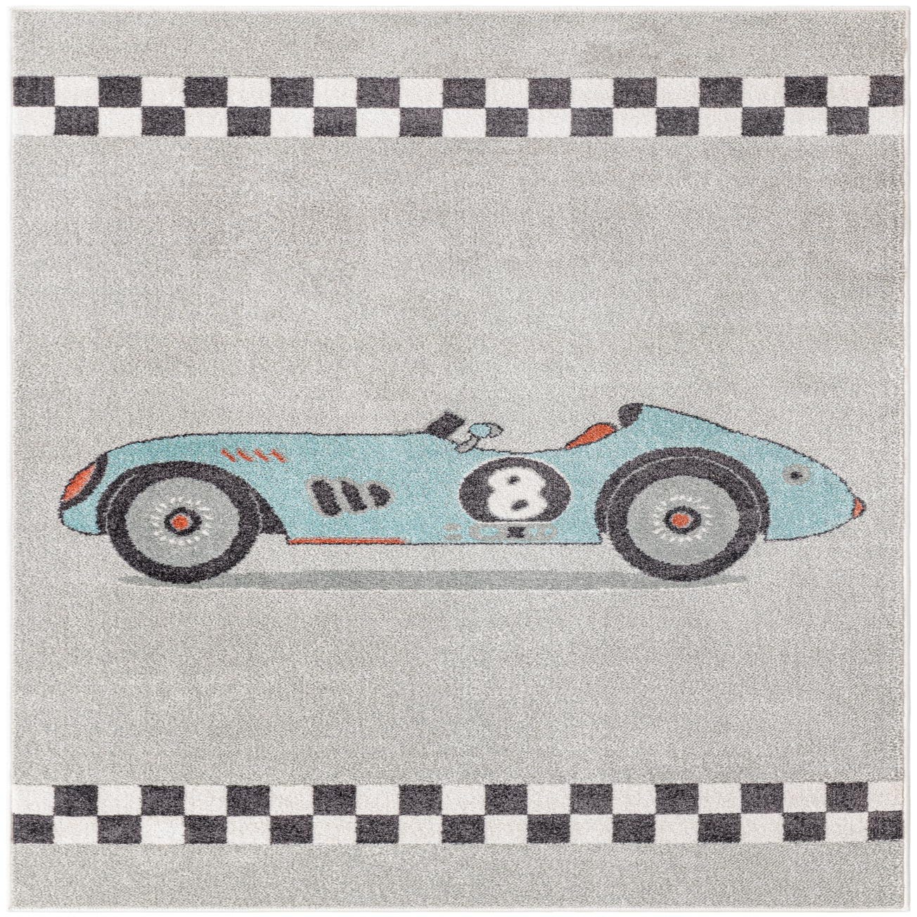 A soft gray field provides a calm backdrop for a playful racing motif: a light-blue vintage race car with a bold #8 medallion, black and ivory wheel details and small red accents. Checkerboard bands in black and ivory run along the top and bottom edges, reinforcing the racetrack theme while keeping the overall look graphic and restrained. The illustration-style car sits slightly raised against the gray field with a subtle shadow that gives the design a sense of motion without cluttering the surface.