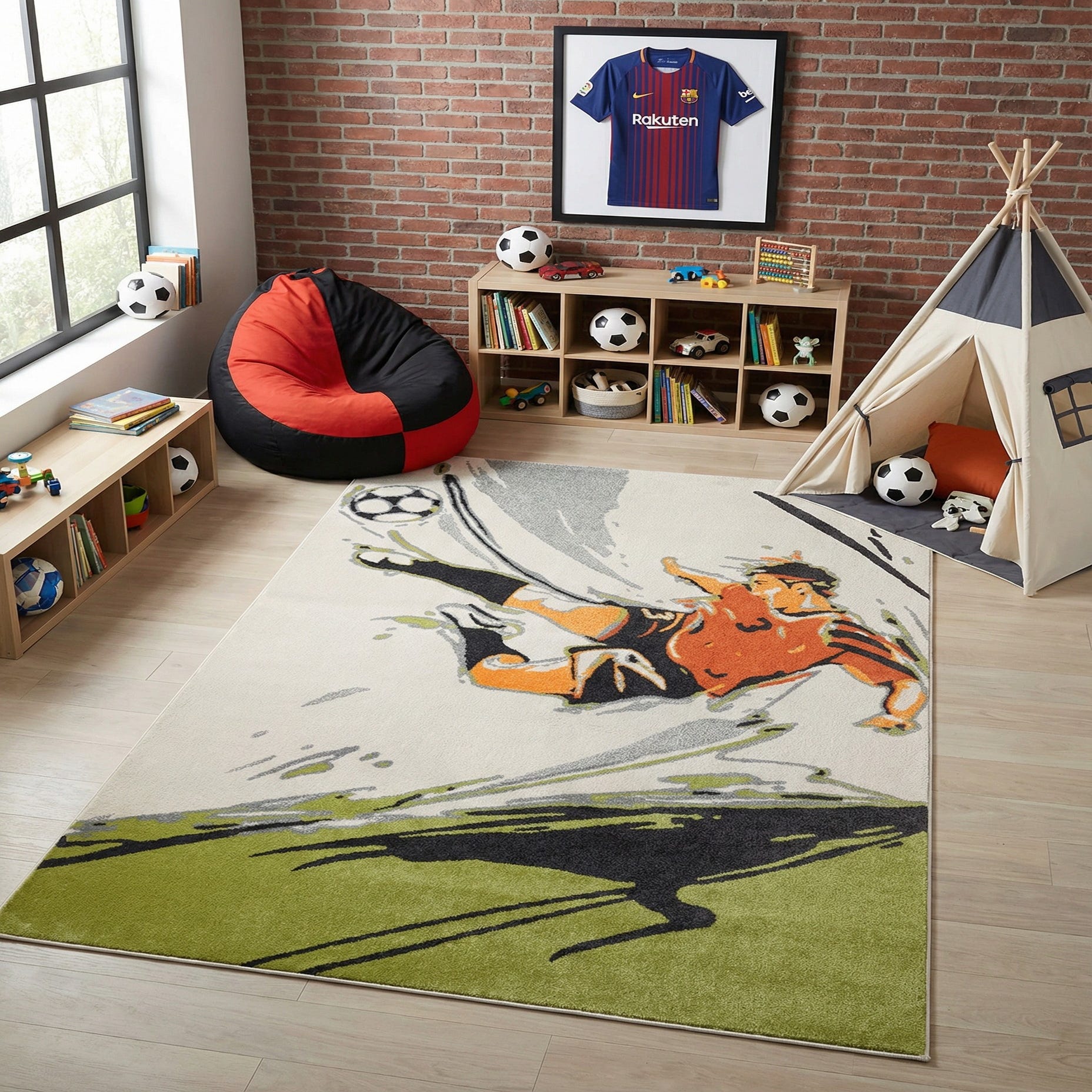 This rug works well in a child's bedroom, playroom, or family recreation area where a sporty, modern touch is desired. Pair it with neutral furniture and accent pillows in red or green to tie the palette together, or place it under a reading nook or activity corner to define the space. It also complements contemporary, minimal decor and themed rooms that favor bold graphics and easy-to-coordinate colors.