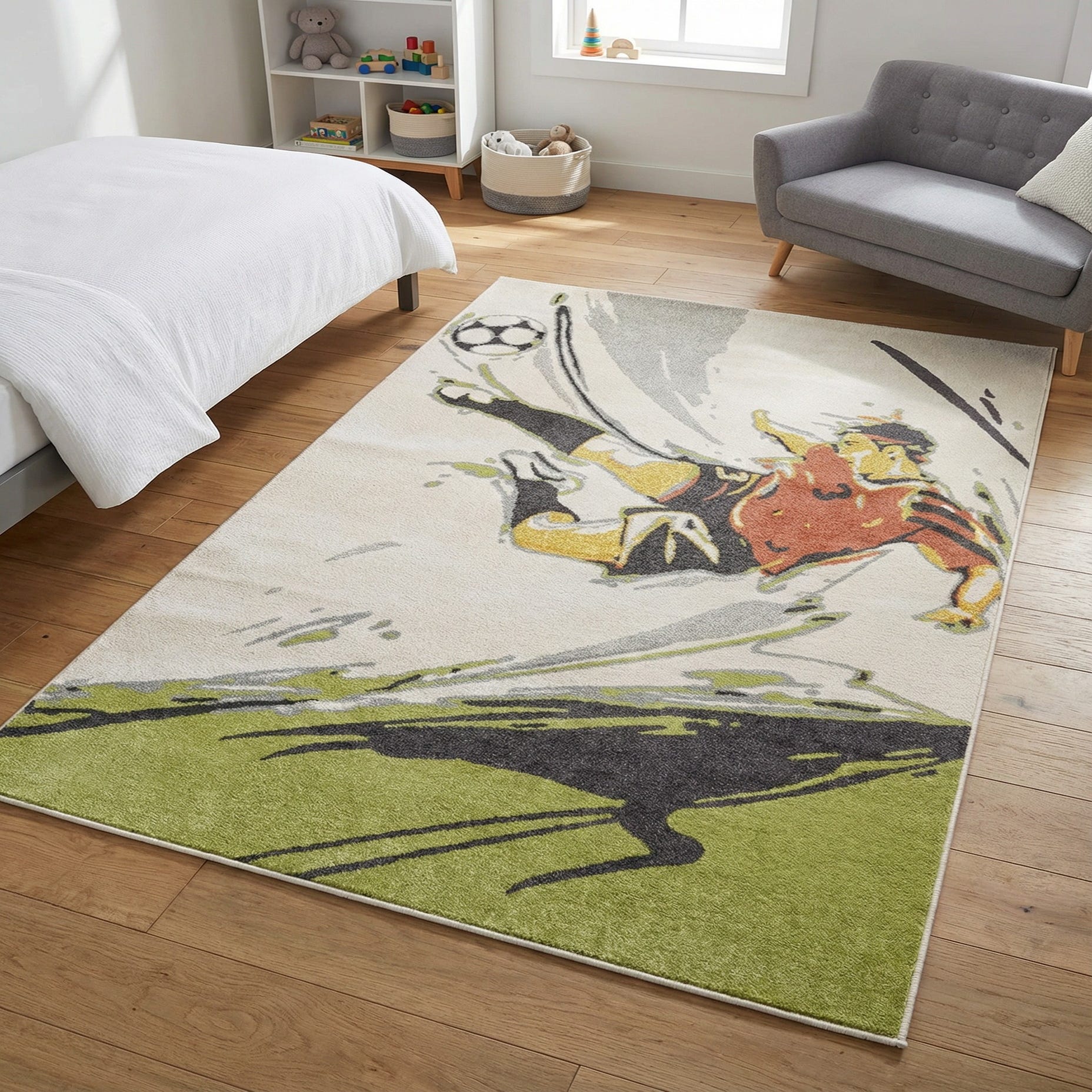 A lively, action-driven design captures a soccer player mid-kick in a painterly, splash-style pattern set against a gray field. Graphic black and ivory lines give definition while pops of red, yellow and green bring energetic contrast to the composition. Machine made of 100% polypropylene, the rug has a low, dense pile that feels springy and smooth underfoot, offering a soft surface for play while maintaining clear, crisp color definition across the design.