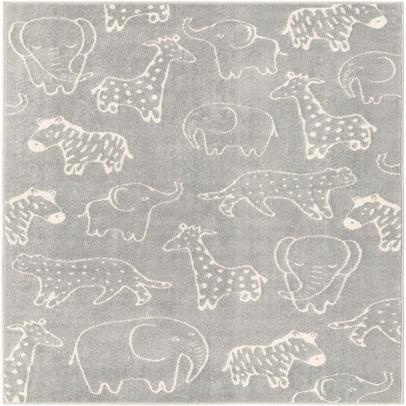 A 5x8 rectangular gray rug with a playful pattern of white outline safari animals like elephants, giraffes, and zebras, ideal for a child's room.