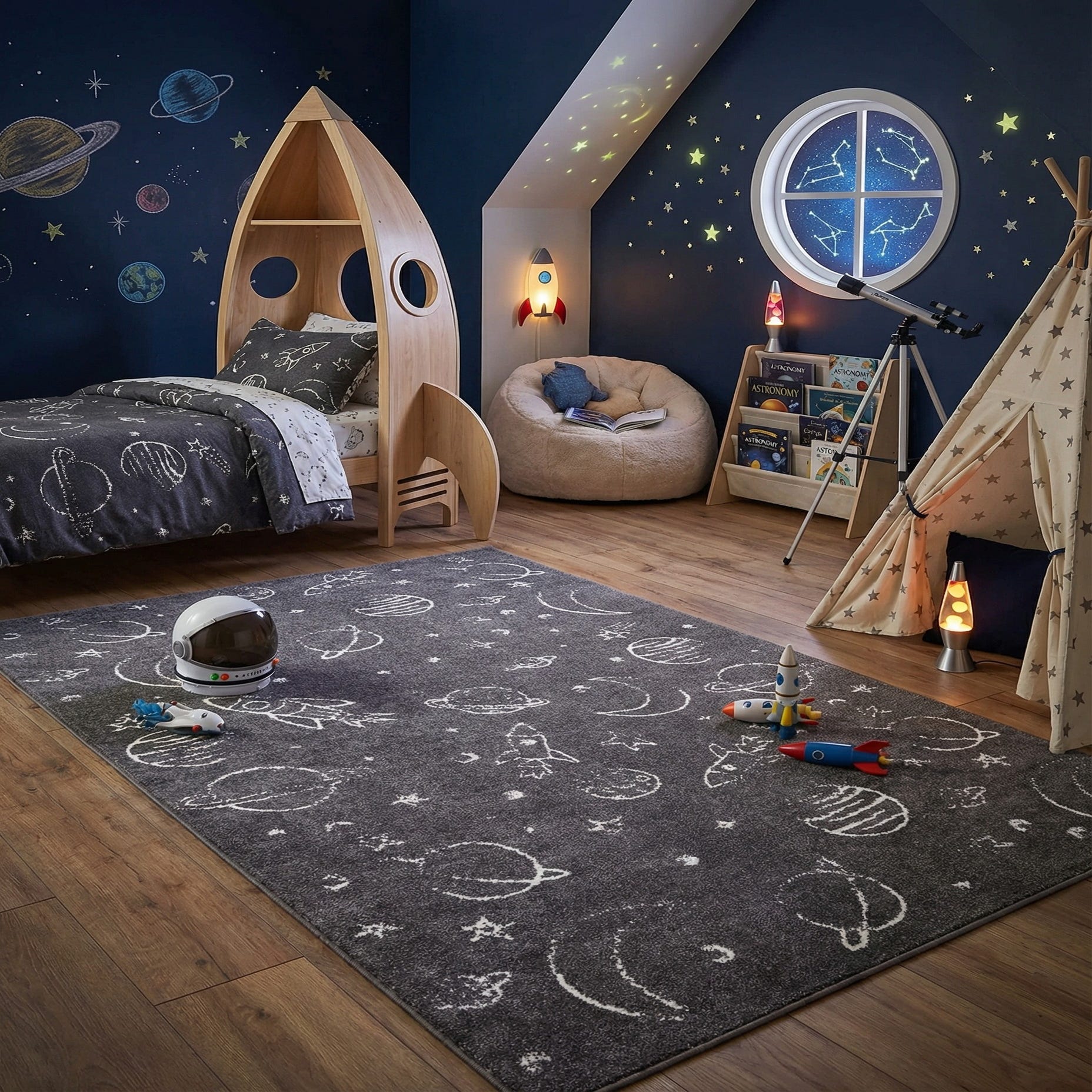 Made from 100% polypropylene, the surface has a low-profile, soft pile that sits comfortably underfoot and holds its shape in everyday use. Place it beneath a reading nook, at the foot of a bed, or in a play area to introduce a subtle space theme; it also works in casual family rooms or entryways where a kid-friendly accent is welcome. Pair with light wood furniture and neutral textiles for a calm look, or add pops of color—teal, mustard, or blush—for a more lively palette.