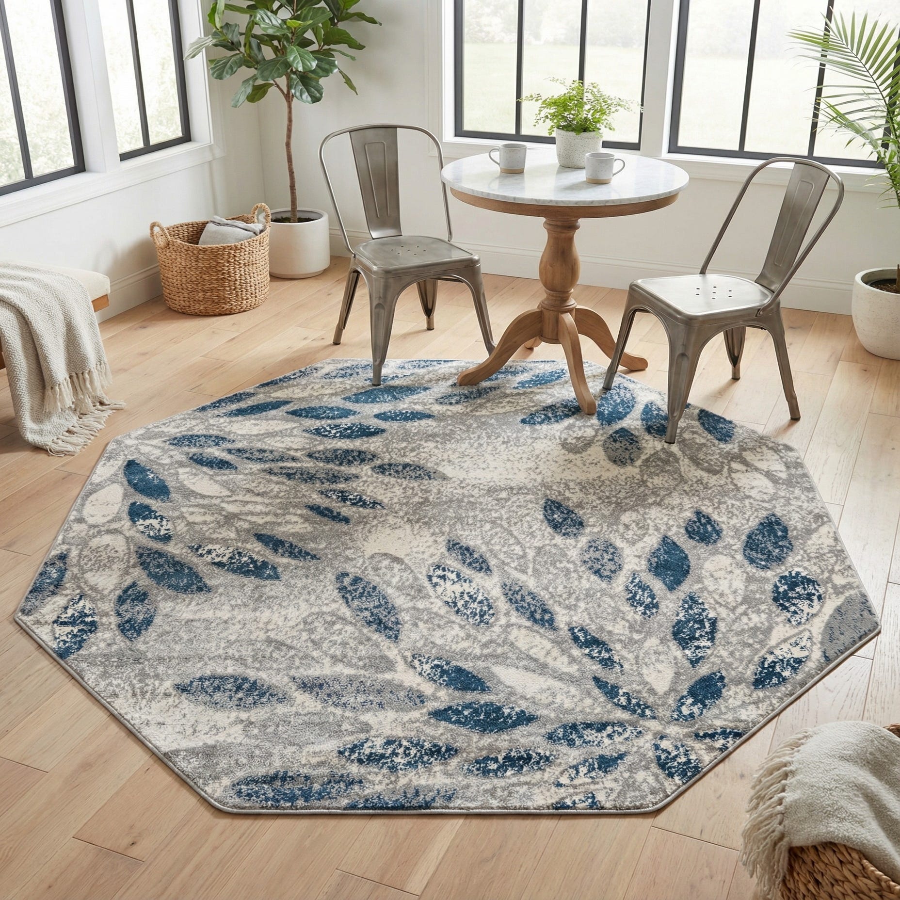 Octagon-shaped gray and silver modern floral rug with scattered dark blue leaf patterns, suitable for indoor spaces.