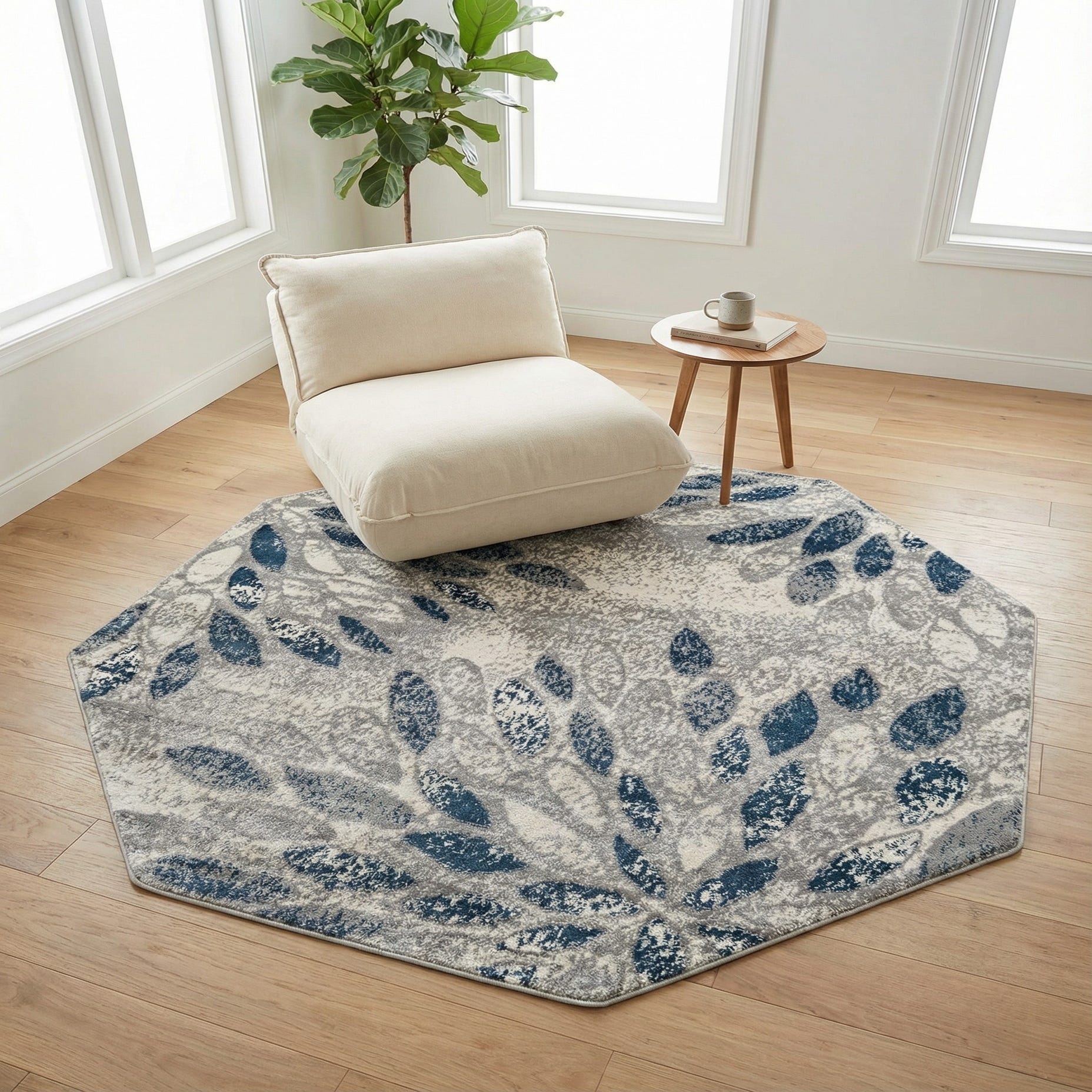 A soft gray field provides a neutral foundation for a loose, leaf-inspired pattern in ivory and navy blue. The navy shapes scatter in a gentle, radial arrangement that reads modern yet organic, while the ivory highlights add contrast and light. The octagonal silhouette gives the design a distinctive, finished look that complements both curved and angular furniture.