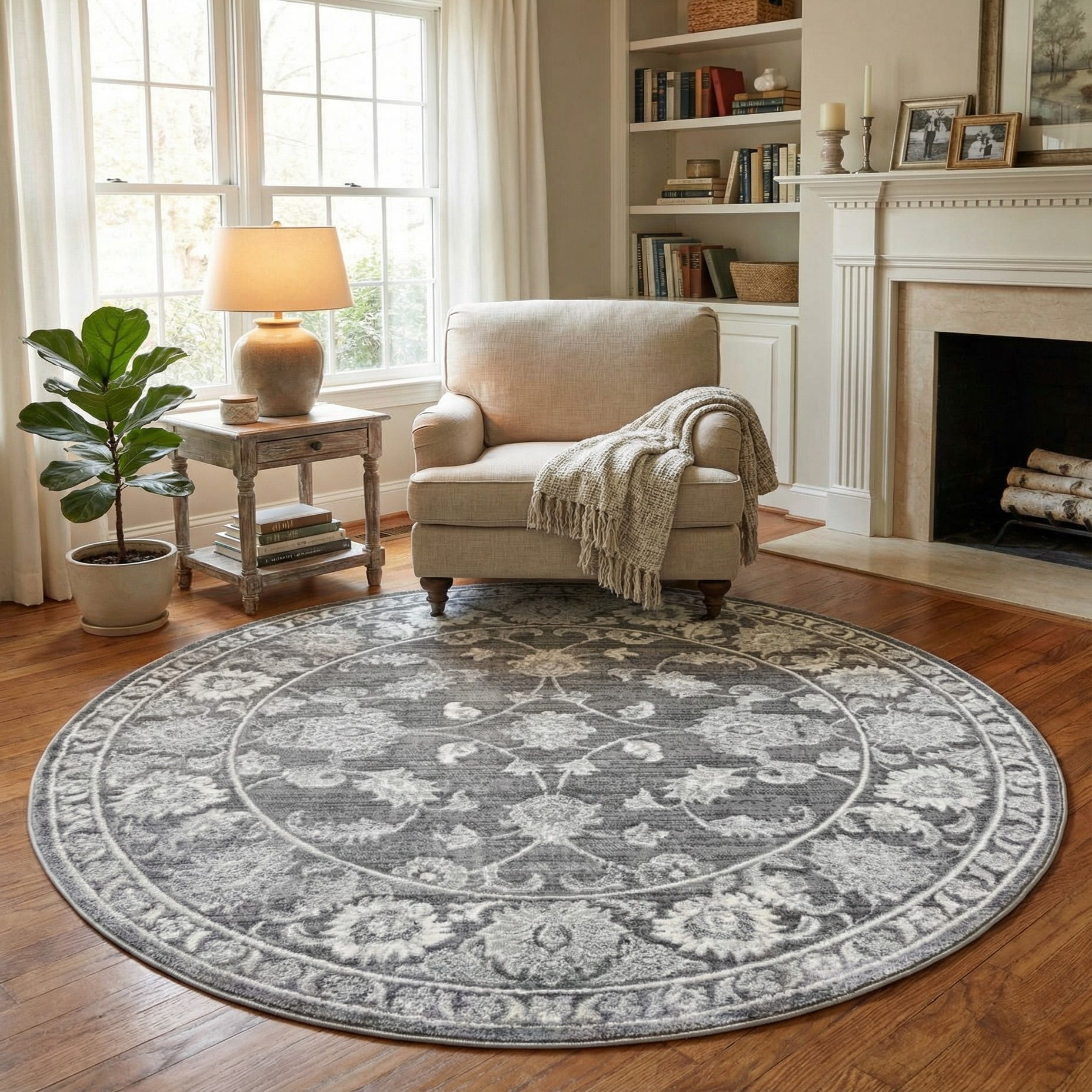 This piece fits well in transitional and classic settings — tuck it beneath a round dining table to ground a conversation area, layer it in a bedroom to add pattern without heaviness, or place it in a home office to introduce a calm, tailored foundation. Its neutral gray-and-ivory palette pairs easily with light woods, cool-toned upholstery, metallic accents, or soft pastels for a composed, inviting look.