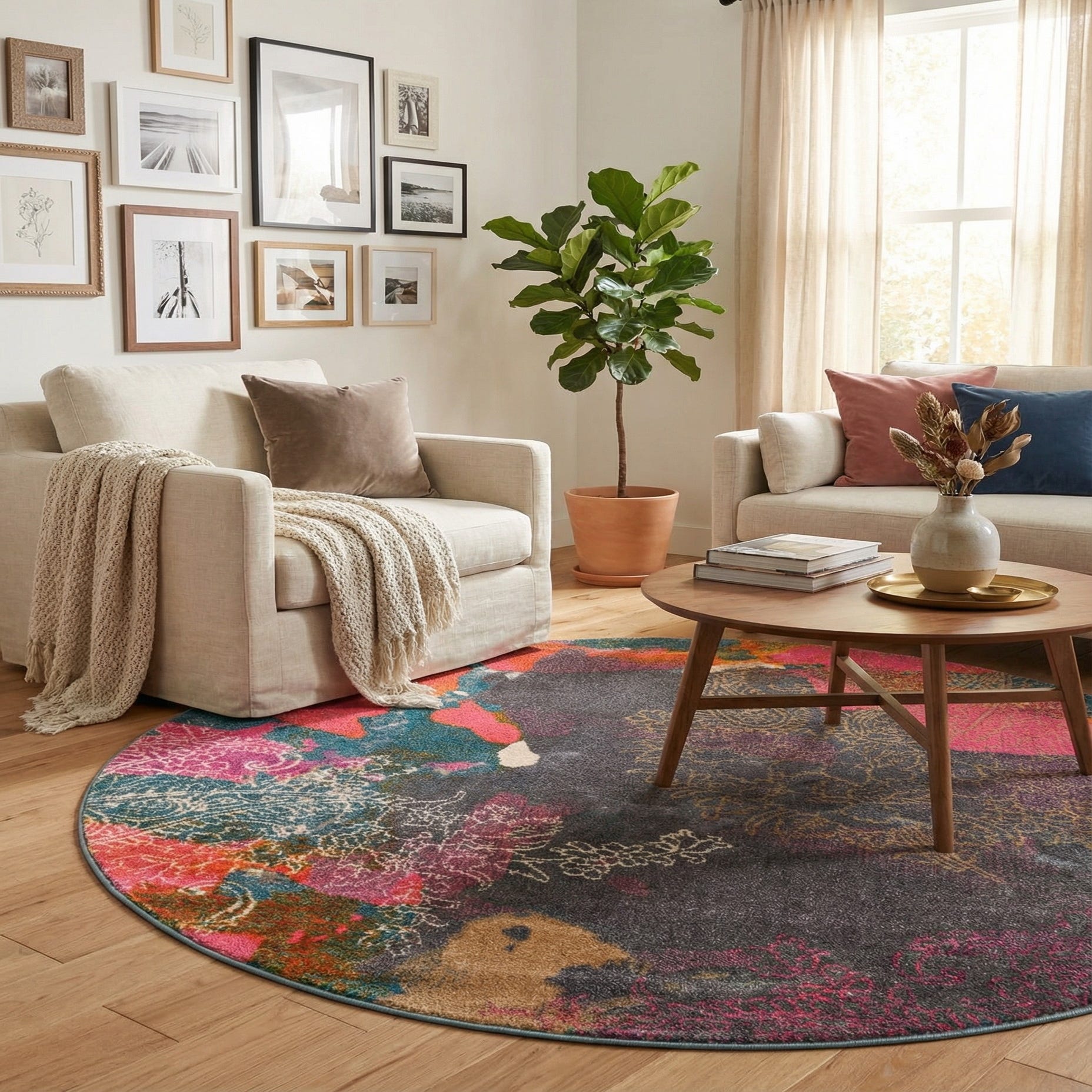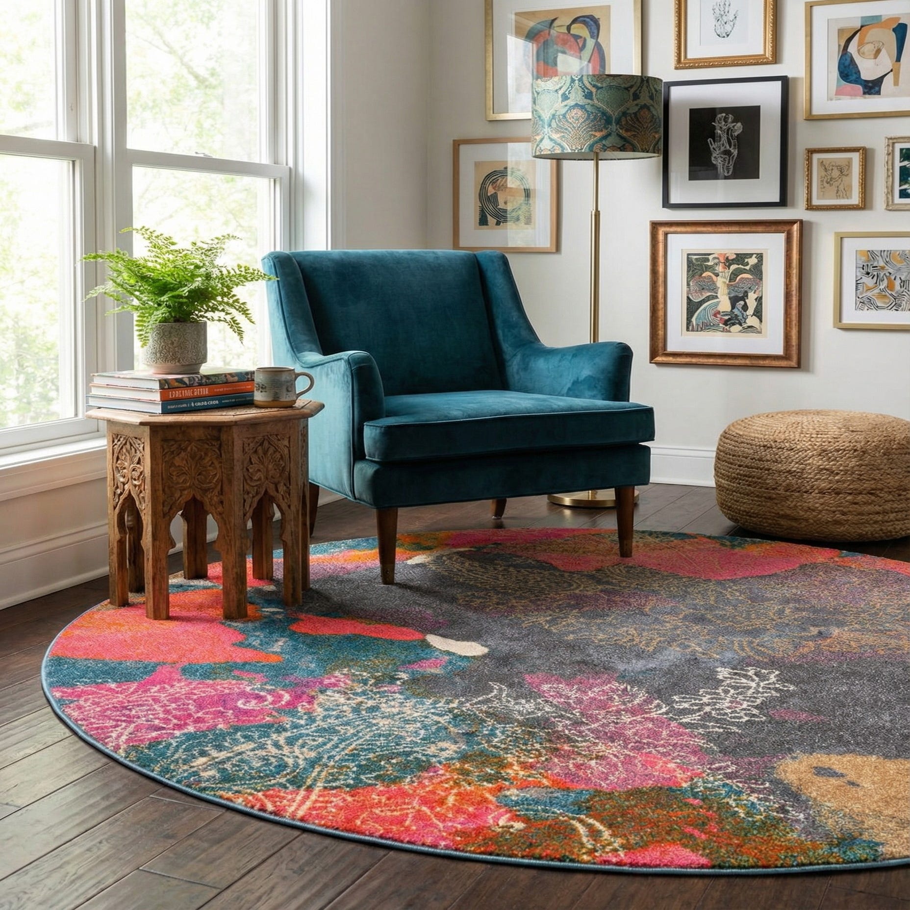 Machine-made from 60% polypropylene and 40% polyester, the rug has a low-to-medium pile with a soft, slightly plush hand and a gentle sheen from the polyester yarns. It anchors a seating cluster or reading nook with personality—place it beneath a round side table, in a cozy bedroom corner, or at the center of an eclectic living area. Pair it with neutral upholstery to let the colors pop, or echo the teal and blush tones in pillows and accessories for a coordinated, lived-in look alongside warm wood or brass accents.