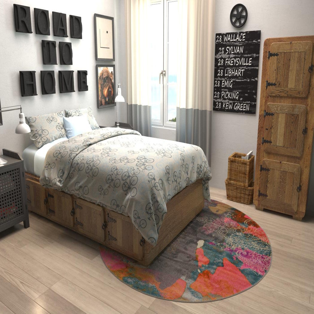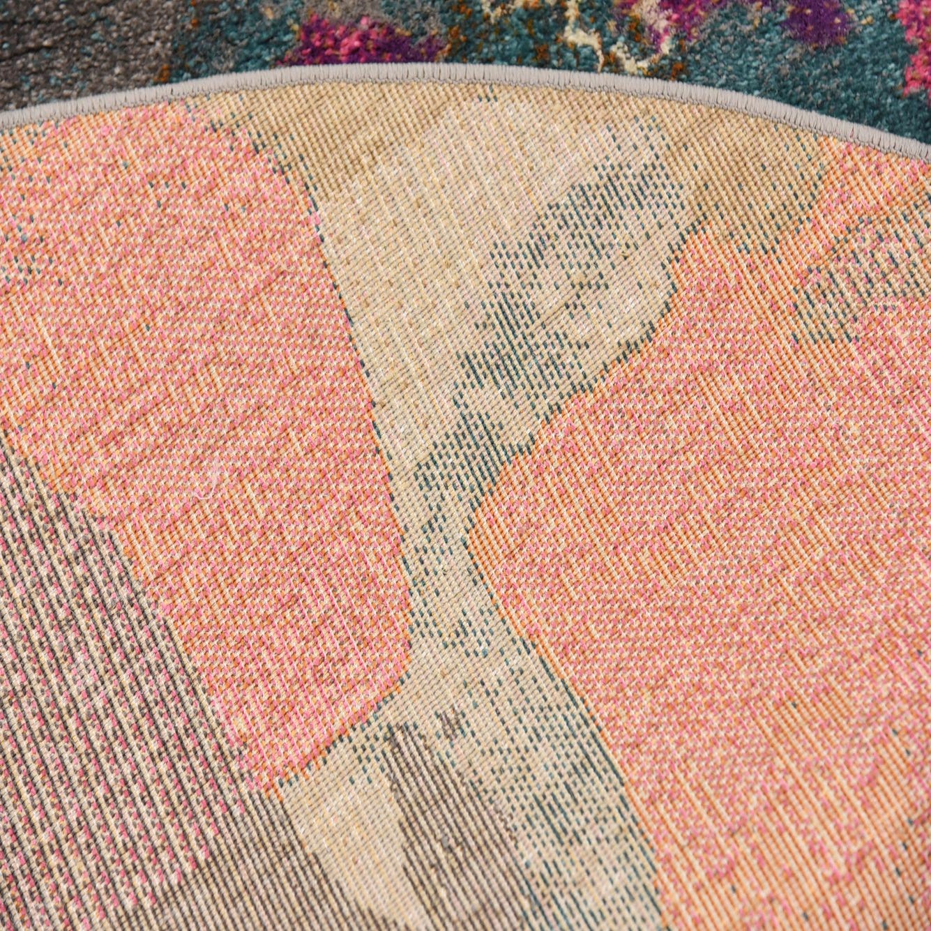 A 6' round Delilah rug featuring a vibrant contemporary floral and paisley pattern in shades of gray, pink, orange, and teal.
