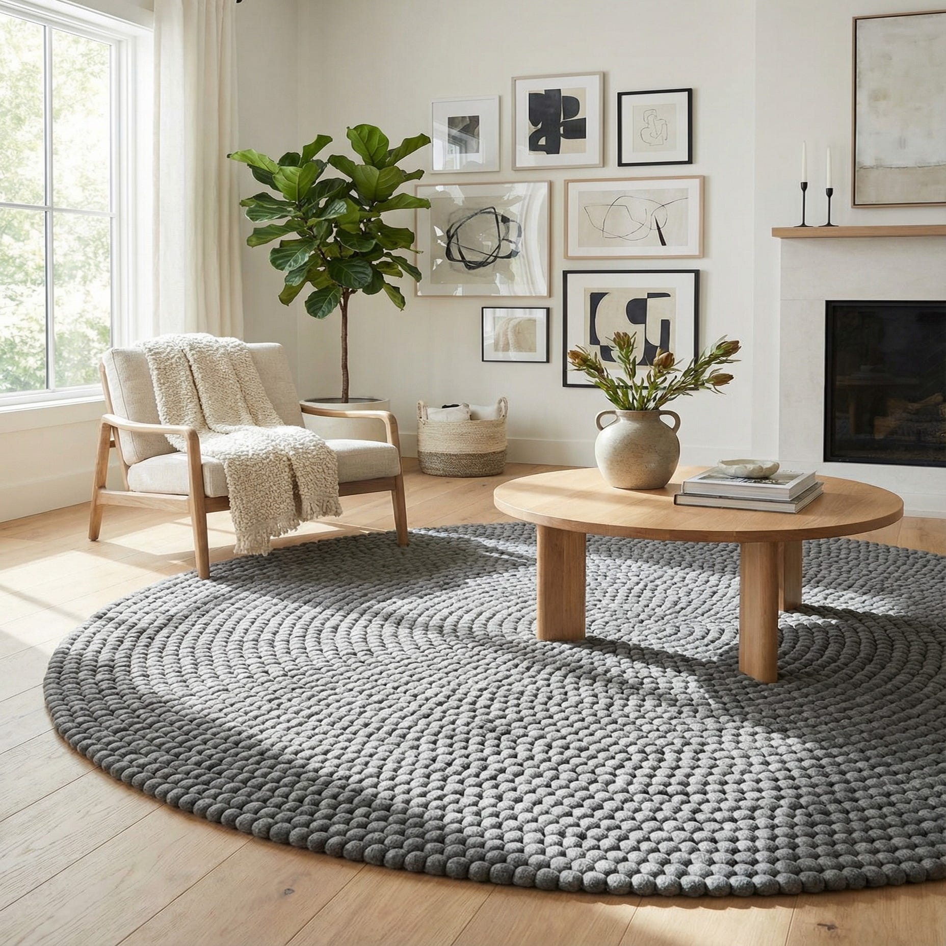 This piece works well in contemporary, Scandinavian, or transitional schemes where texture is needed more than pattern. Use it to anchor a small round dining or bistro table, layer it beneath an armchair in a reading nook, or place it in a nursery or casual sitting area to introduce softness and visual warmth. The neutral gray pairs cleanly with light woods and whites for a modern look, or with deeper tones and layered textiles for a cozier, more collected feel.