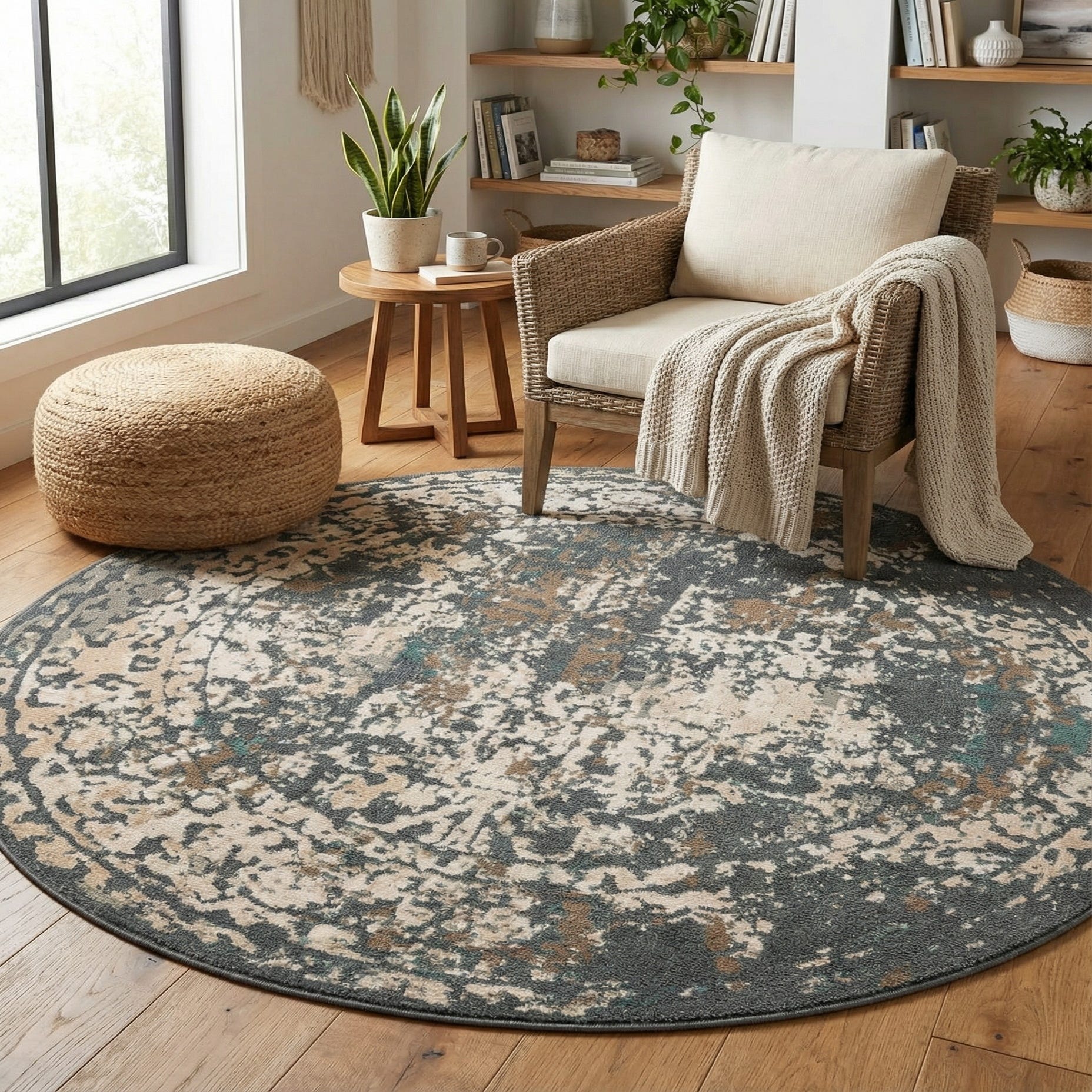 Machine-made from 100% polypropylene, the construction delivers a durable, low-profile surface that works well in everyday spaces. Place it beneath a round dining table or a small breakfast nook to define the area, center it under a round coffee table in a living room, or use it to add softness to a bedroom seating corner. Its neutral gray base and warm accent tones pair nicely with natural wood, metal accents, and contemporary or transitional furnishings.