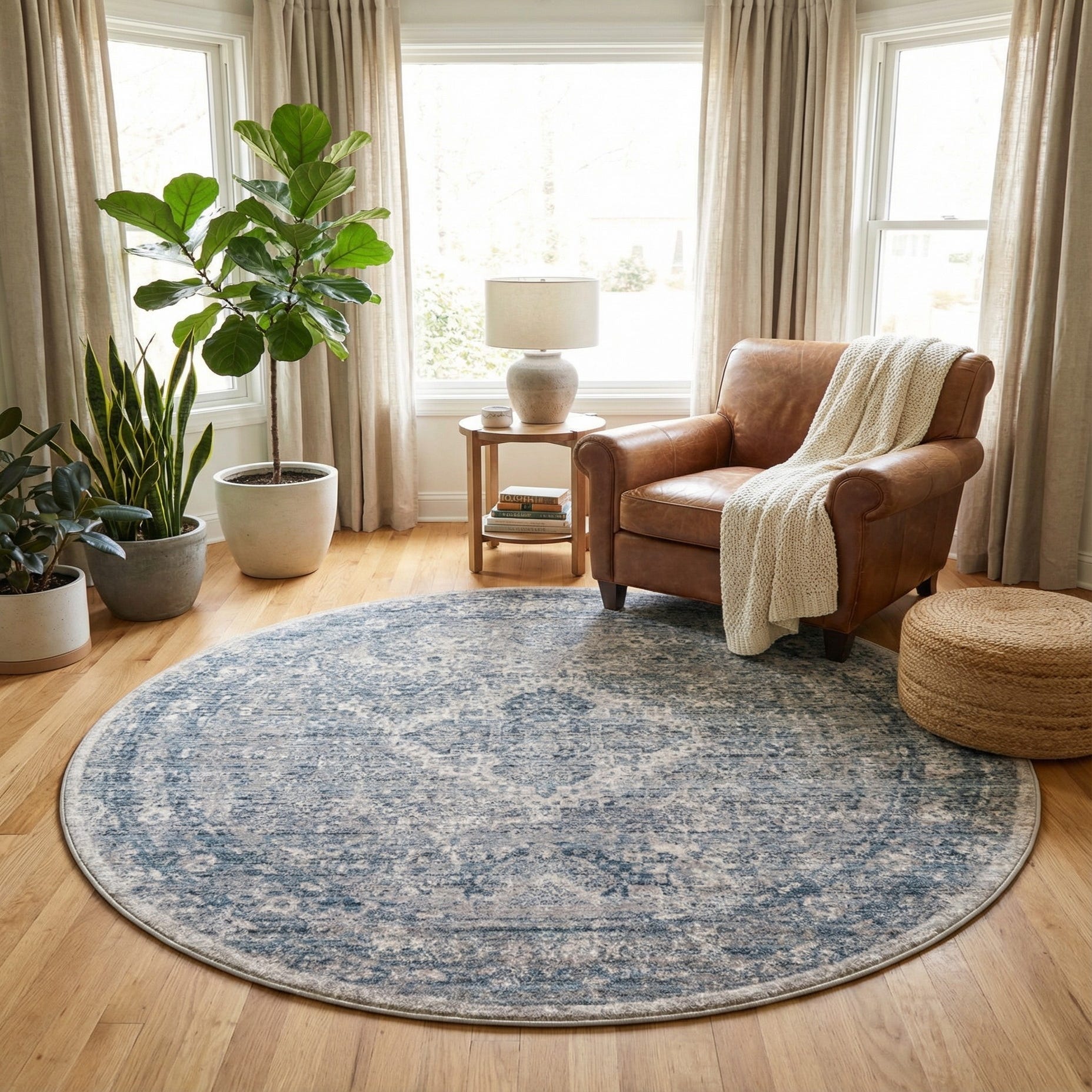 Place this round rug beneath a small round dining table or in a cozy seating arrangement to anchor the space without overwhelming it. It also works well as a focal point in a bedroom seating area, a casual living room, or a reading nook where layered neutrals and cool blues are part of the palette. Pair it with light wood furniture and ivory textiles for an airy, coastal-inspired room, or combine with navy accents and metal finishes for a more grounded, transitional look.