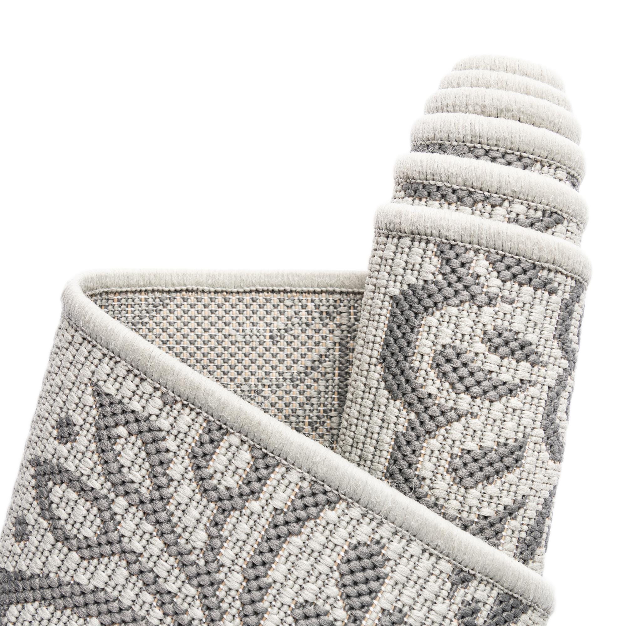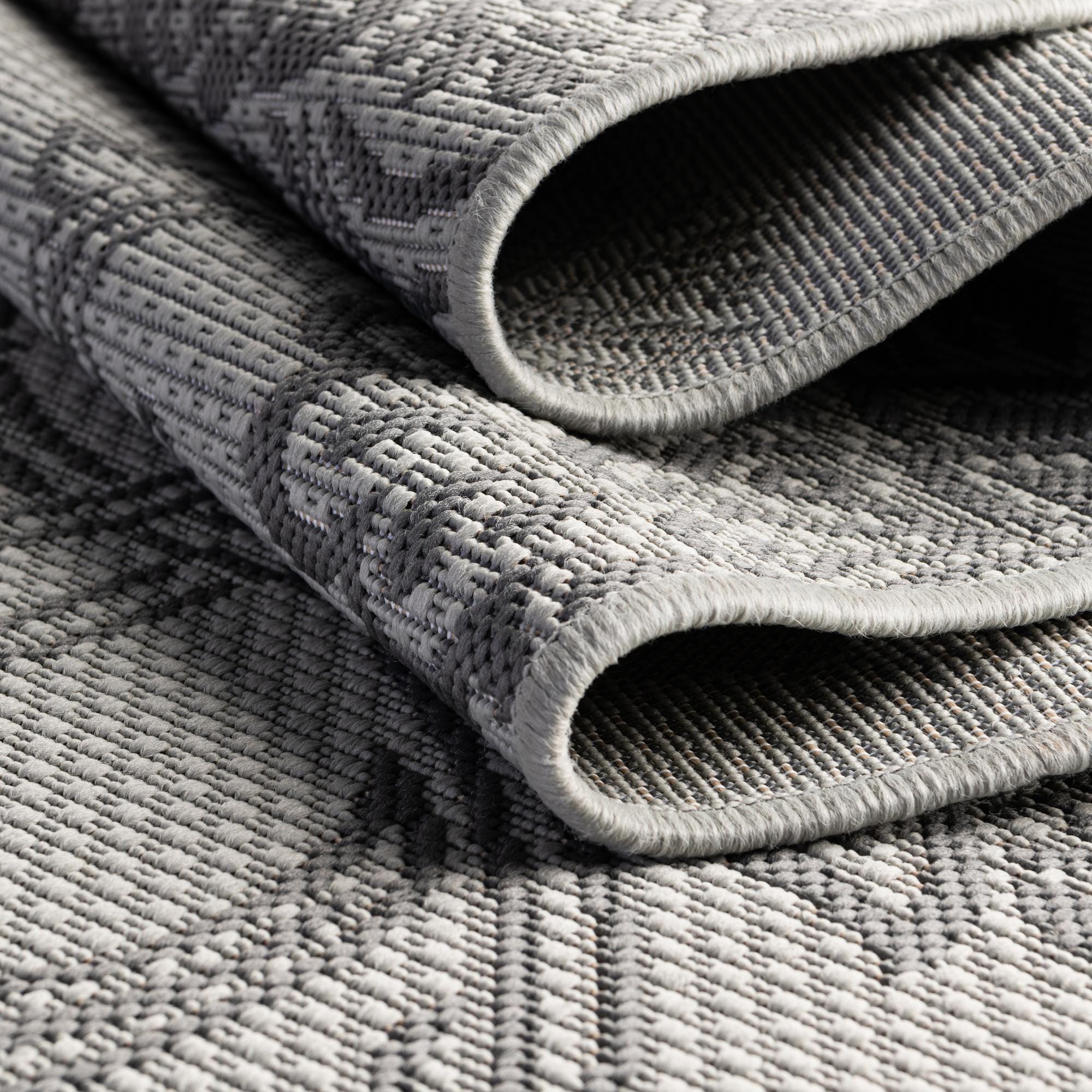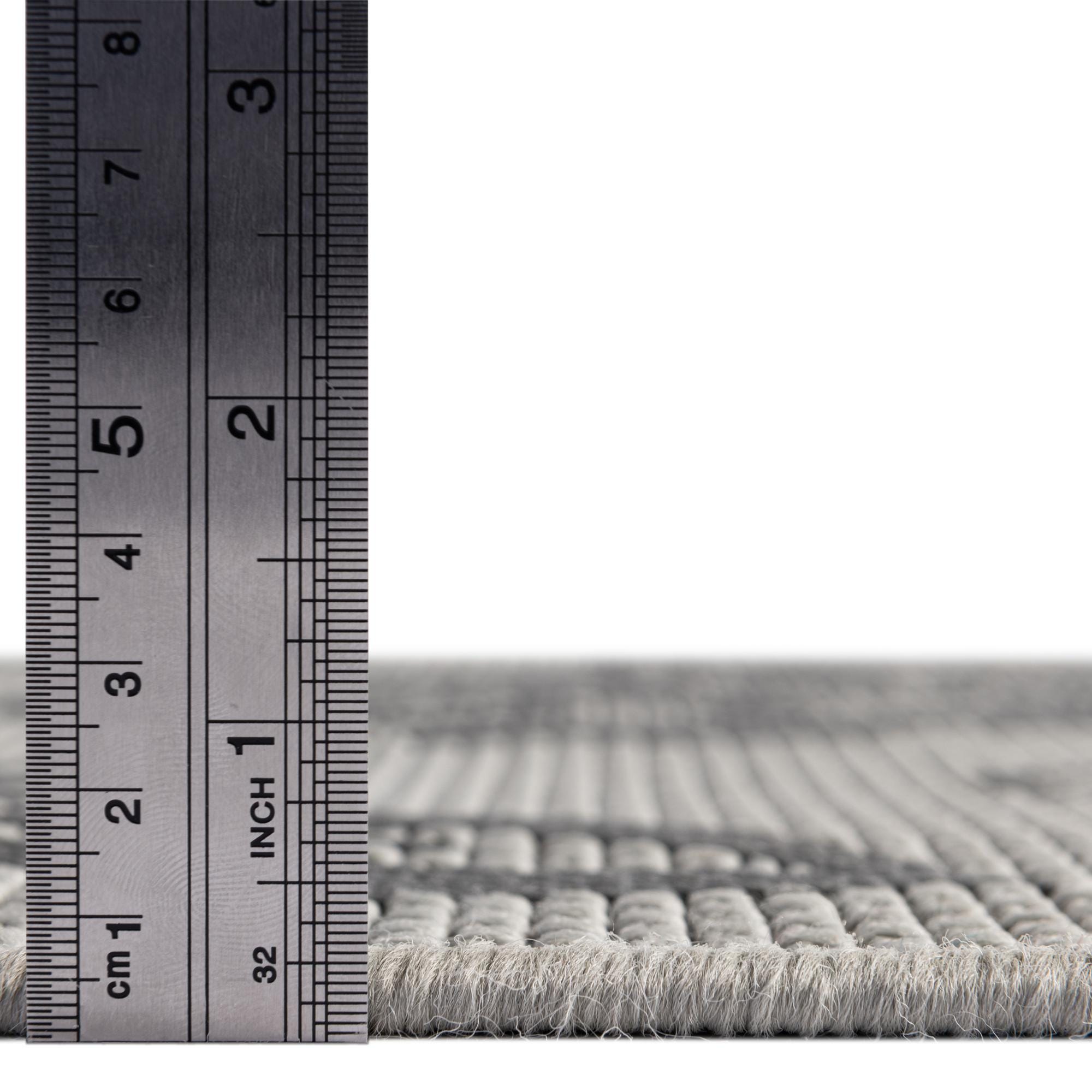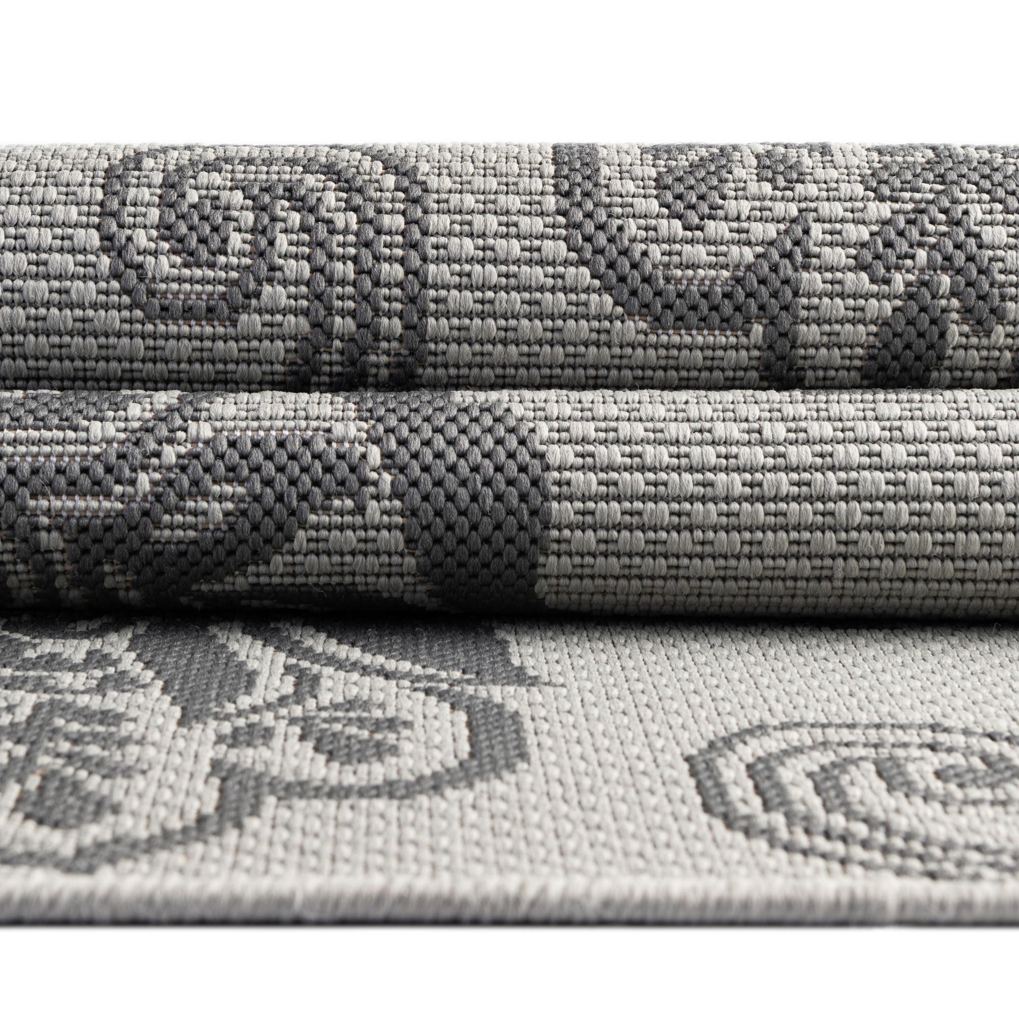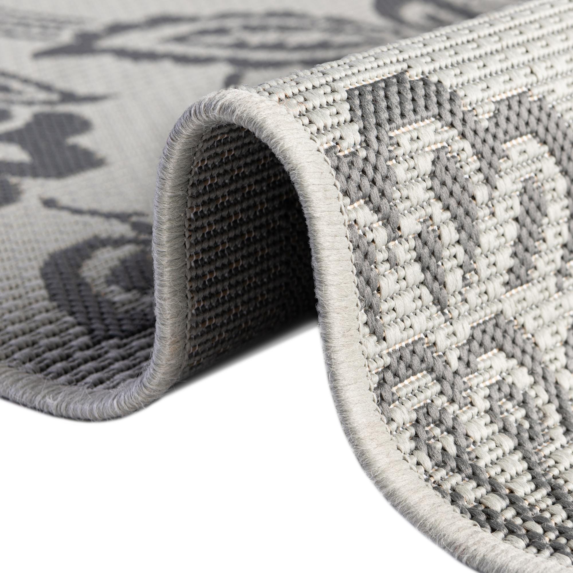 A graceful botanical pattern of swirling vines, stylized blooms and layered leaves plays across a gray ground, rendered in a cool silver tone that creates a calm, monochromatic look. Machine-made from 100% polypropylene, the rug has a low-profile, flat-woven surface with a subtle ribbed texture you can feel beneath your feet—smooth and steady rather than plush—so the floral motif reads clearly without added pile height.