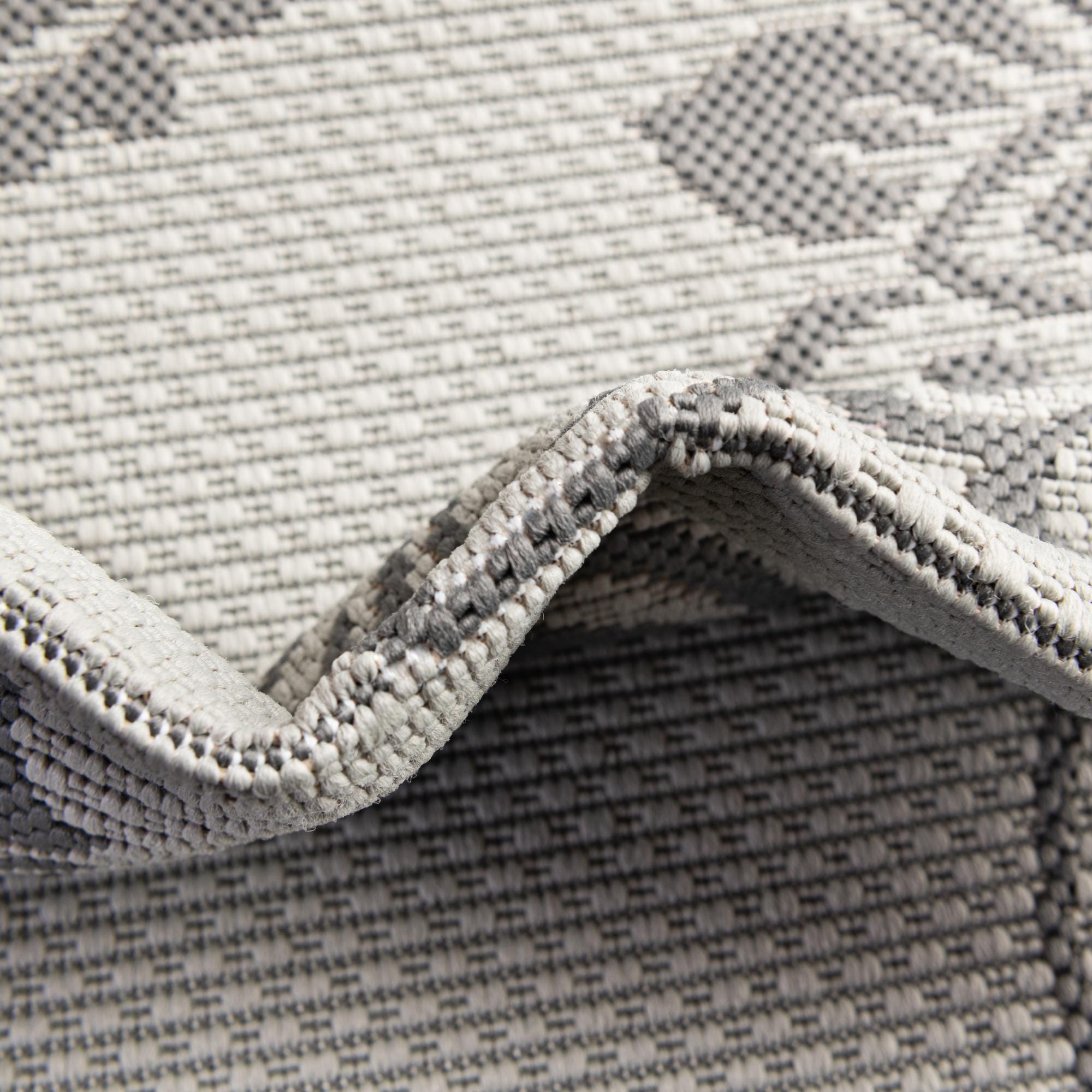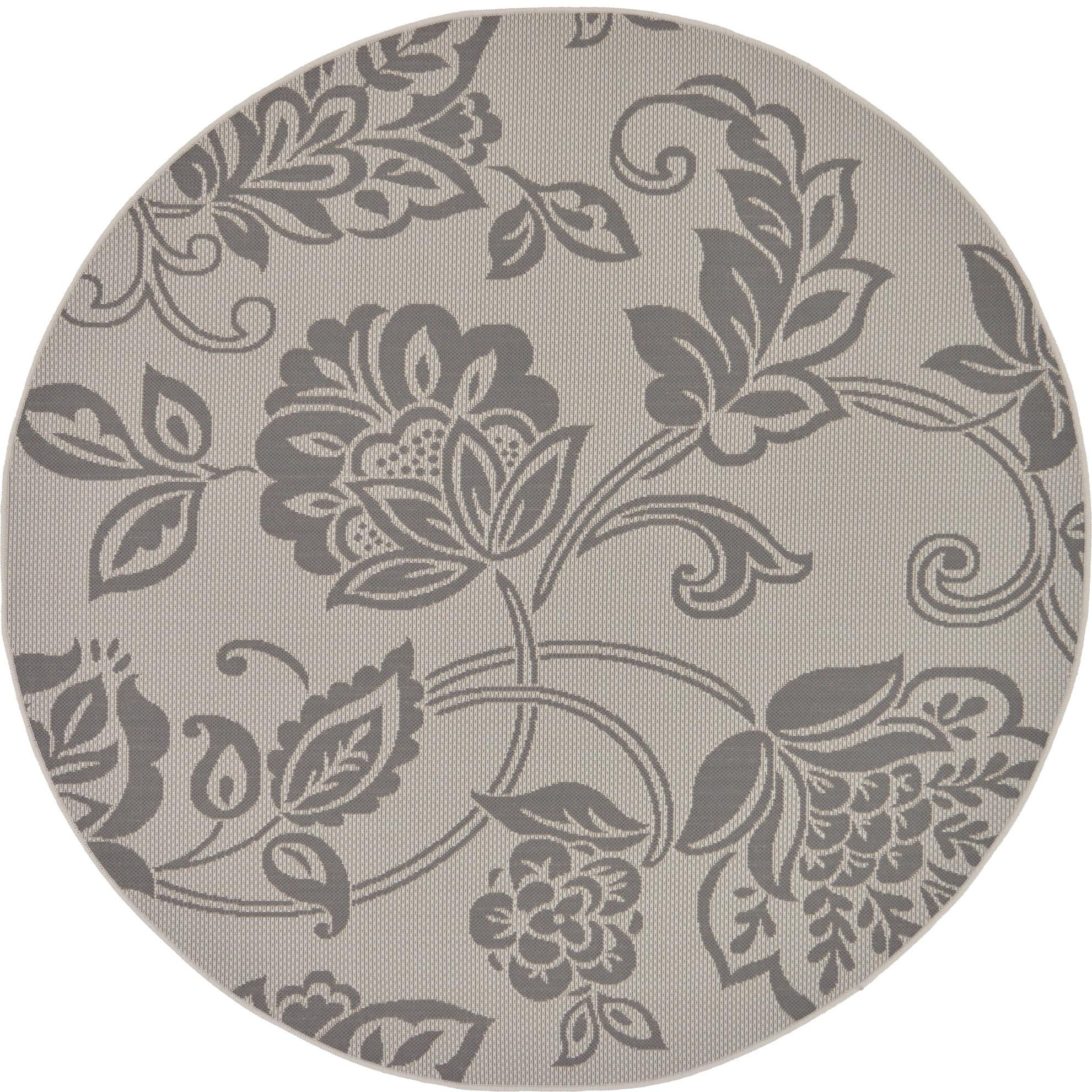A 6' round gray indoor/outdoor rug with an intricate botanical floral pattern, perfect for a patio.