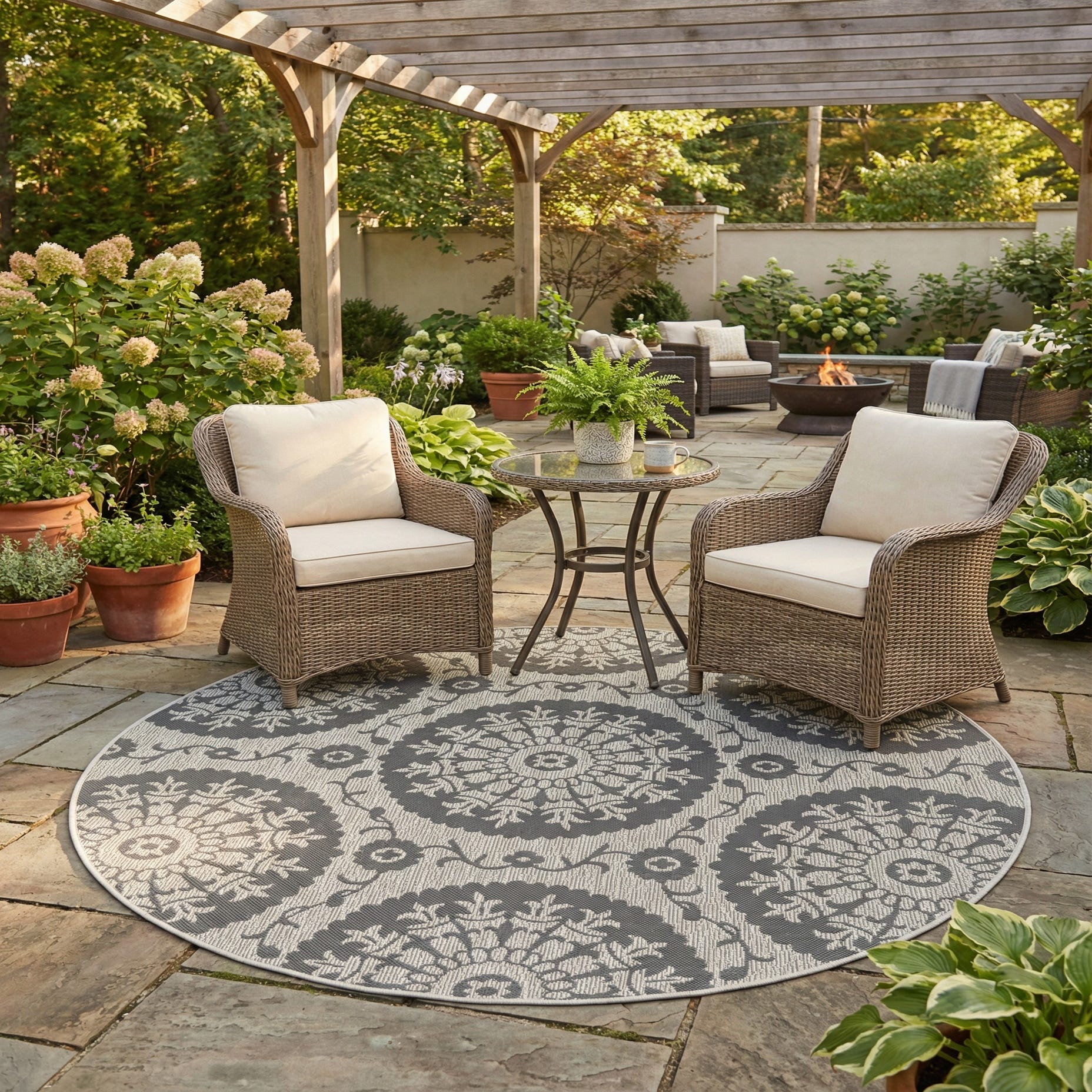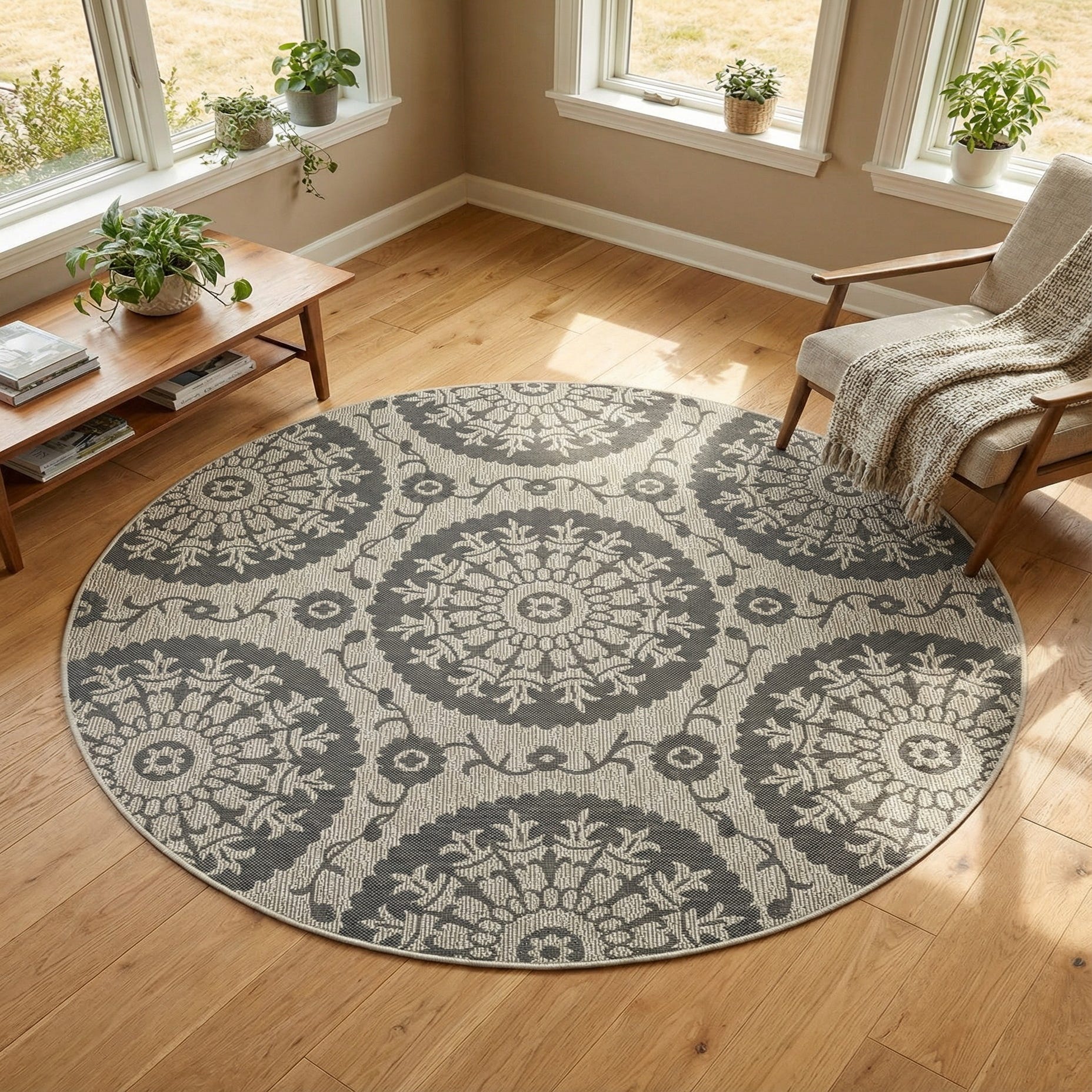 The round shape works naturally beneath a small dining table or a bistro set on a covered patio, and it also makes a confident statement in an entry, sunroom, or balcony seating area. Its gray-and-silver palette pairs easily with cool-toned furnishings and natural wood, fitting contemporary, coastal, and modern farmhouse decor schemes where a durable, decorative anchor is needed.