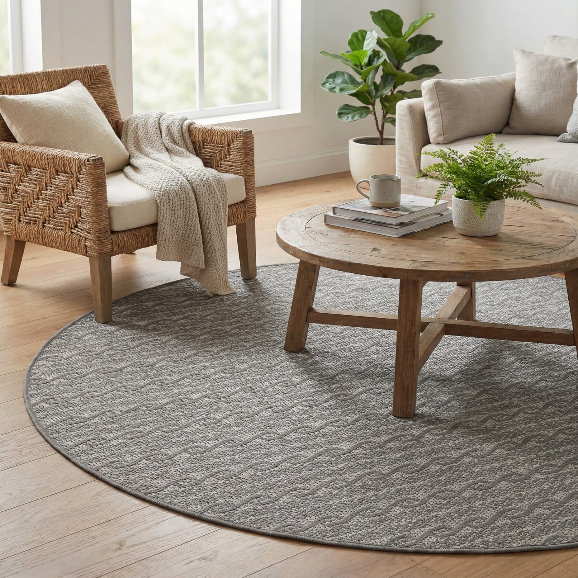 The round shape naturally anchors small seating arrangements, a bistro set, or a covered porch conversation area, and its restrained palette complements contemporary, coastal-modern, or minimalist interiors. Pair it with metal or teak furniture and soft neutral cushions for a polished outdoor living space, or use it inside a sunroom or casual dining nook to introduce pattern without overpowering other textiles.