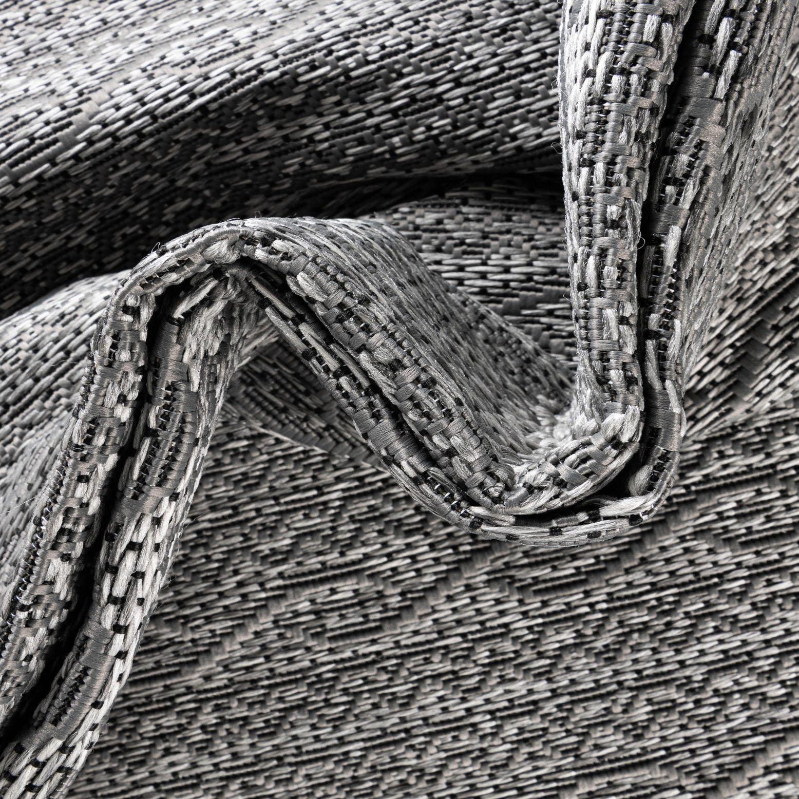 The round shape naturally anchors small seating arrangements, a bistro set, or a covered porch conversation area, and its restrained palette complements contemporary, coastal-modern, or minimalist interiors. Pair it with metal or teak furniture and soft neutral cushions for a polished outdoor living space, or use it inside a sunroom or casual dining nook to introduce pattern without overpowering other textiles.