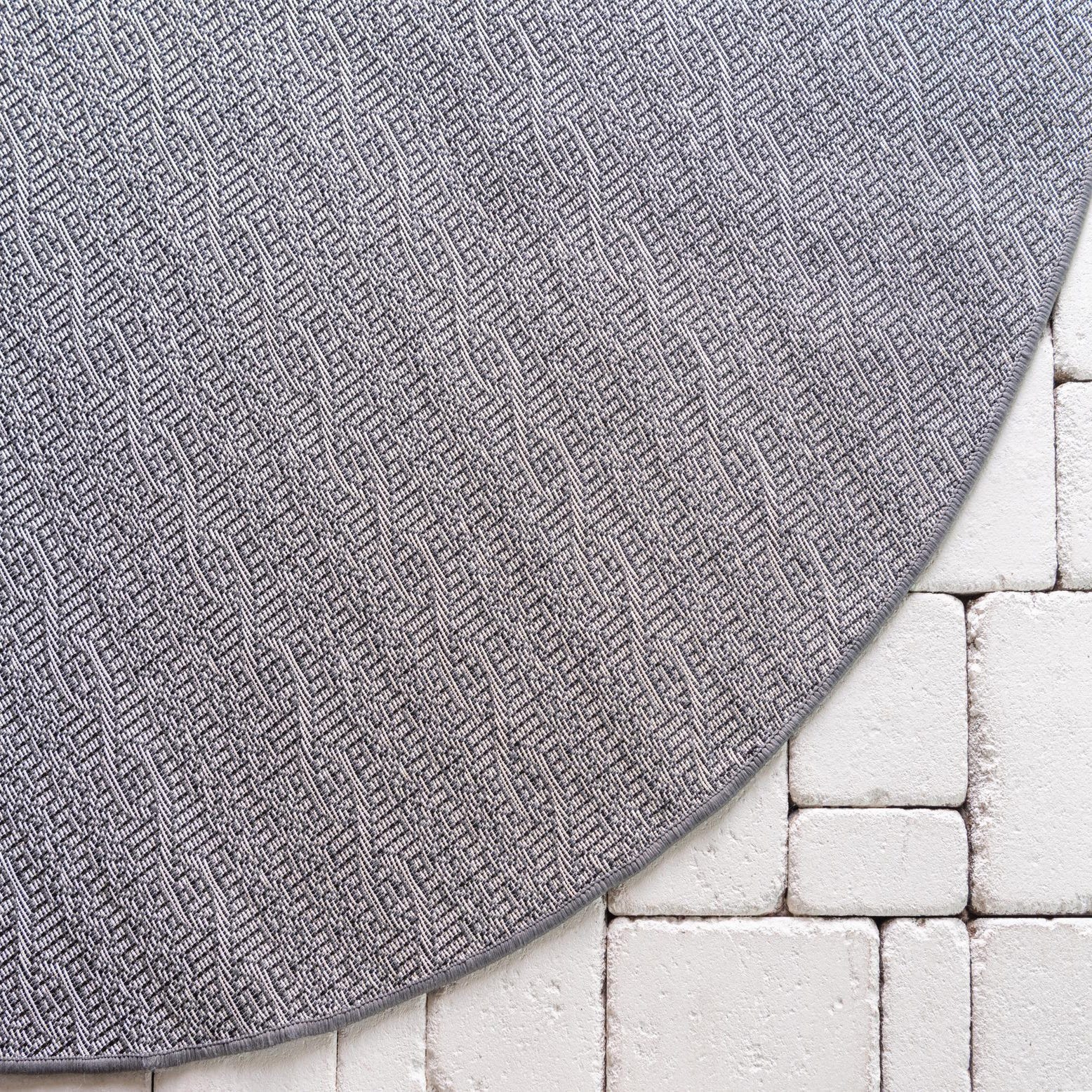 A 6' 0 x 6' 0 round gray indoor/outdoor rug with a subtle textured wave pattern, ideal for a patio.