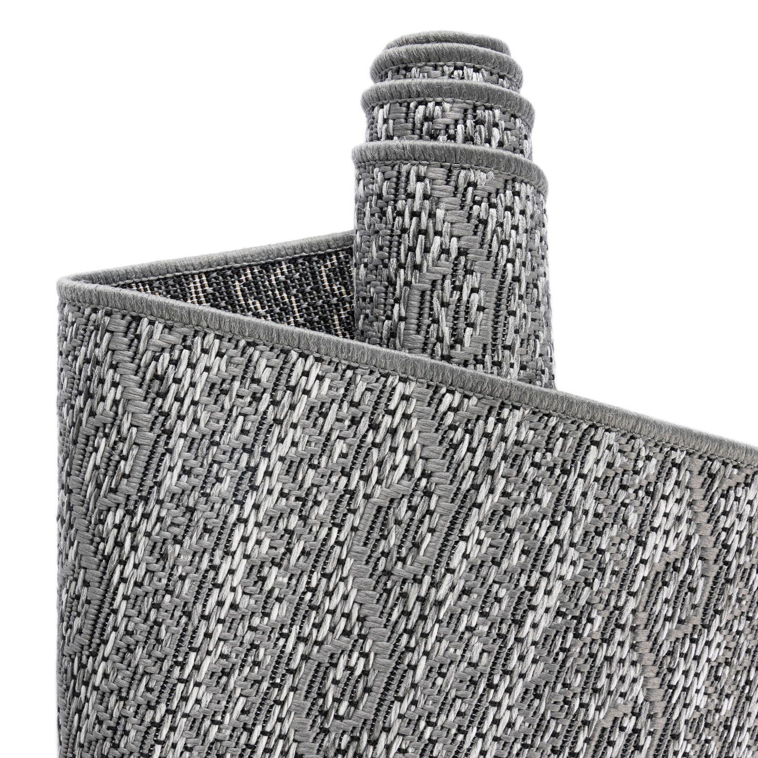 A modern, low-profile round rug woven in gray with silver accents, this piece pairs subtle geometric rows with a repeating, wave-like motif for a calm, structured look. The background gray provides a neutral foundation while the silver threads form delicate horizontal bands that catch light and add visual depth. Machine made from 100% polypropylene, the tight flat weave presents a smooth, slightly textured surface that reads clean and tailored underfoot.