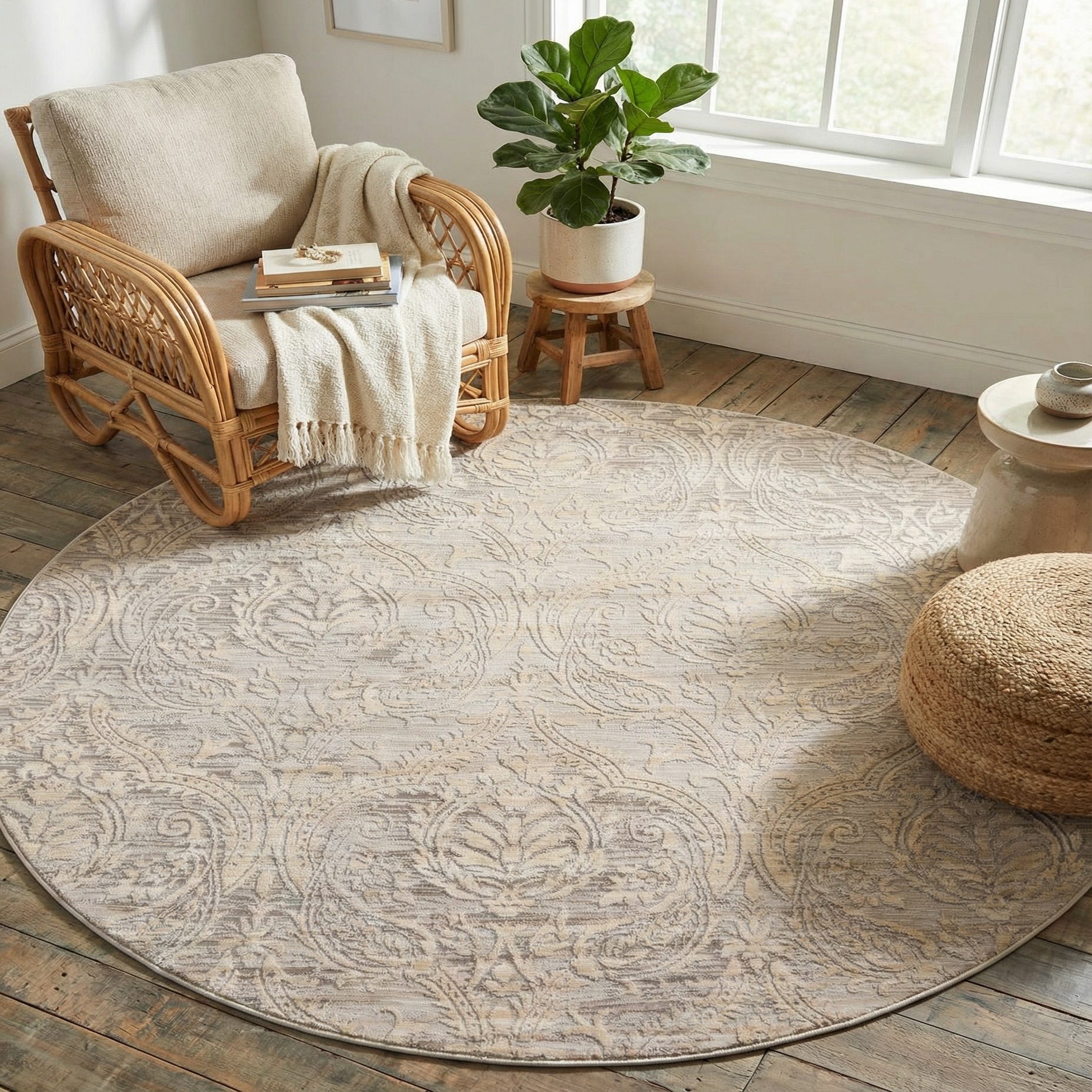 This round shape and neutral palette work well in living rooms beneath a circular coffee table, in a breakfast nook to define a cozy dining area, or layered under seating in a bedroom for added warmth. Its transitional styling pairs easily with modern, coastal, or traditional furnishings—use it to soften hardwood floors, anchor a neutral color scheme, or add a quiet pattern to a minimally decorated space.