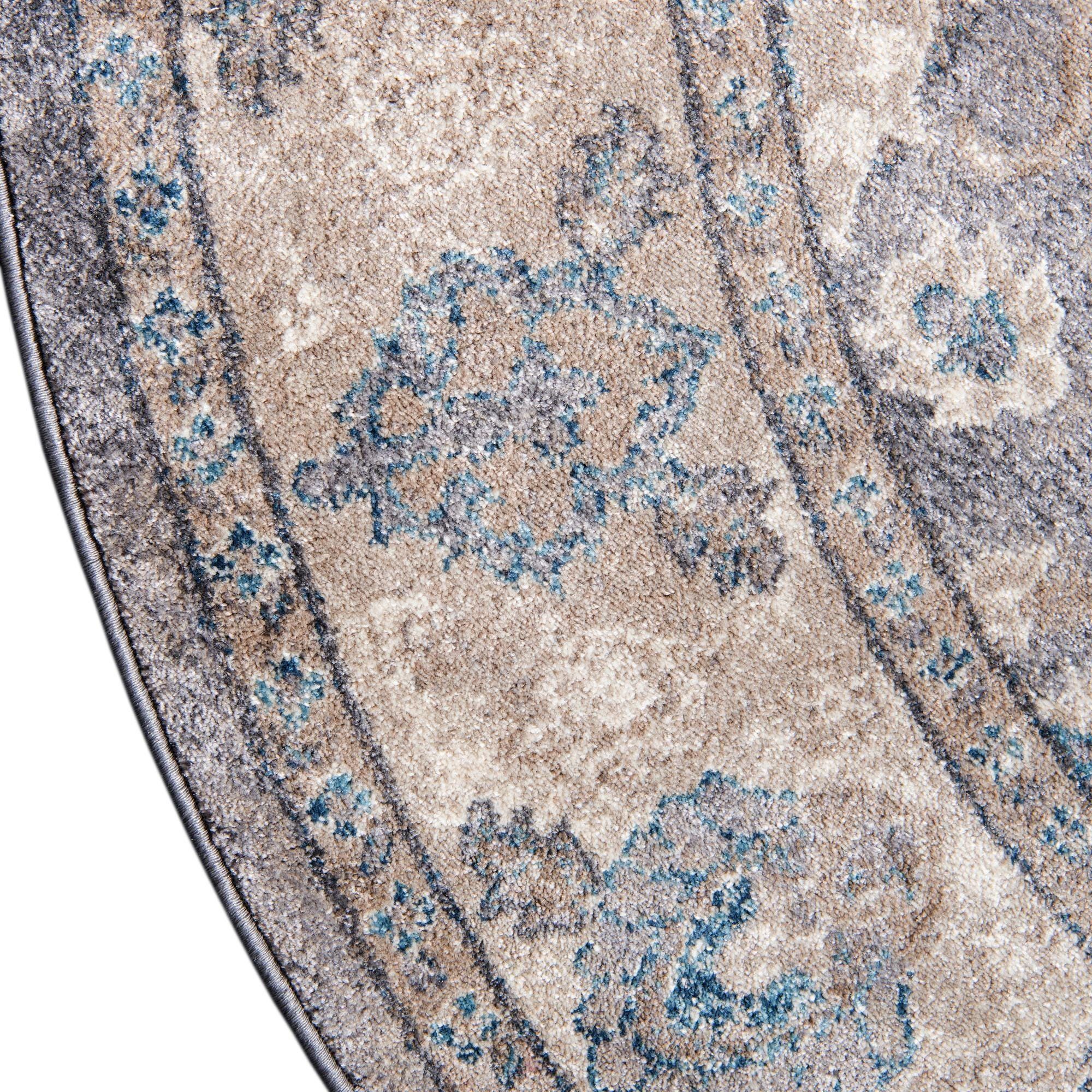 Machine-made from 100% polypropylene, this round piece works well beneath a circular dining table, centered in a small living area, or as an anchor for a bedroom seating nook. Its neutral gray base and cool blue accents pair nicely with light wood or painted furniture, coastal palettes, and transitional interiors where soft patterning and understated color are preferred.