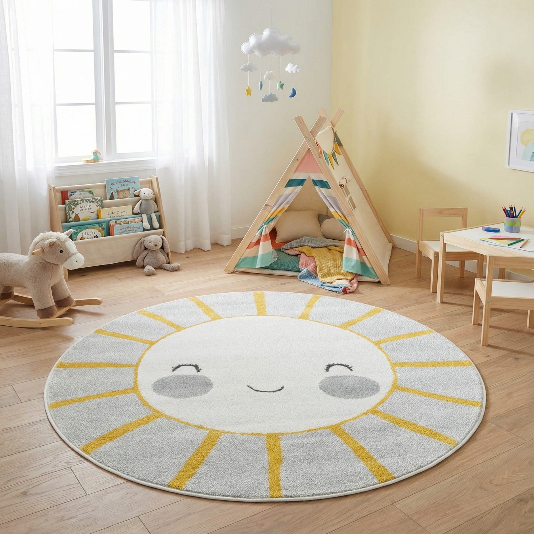 Ideal for a nursery, playroom, or a cozy reading corner, this round rug defines space while adding a cheerful focal point. Pair it with light wood furniture and soft pastels for a Scandinavian-inspired kid’s room, or use it to brighten a modern neutral space where the yellow accents can tie into pillows or wall art. The circular shape works well beneath a small table, under a play tent, or layered in a casual family area to create a warm, inviting spot for play and relaxation.