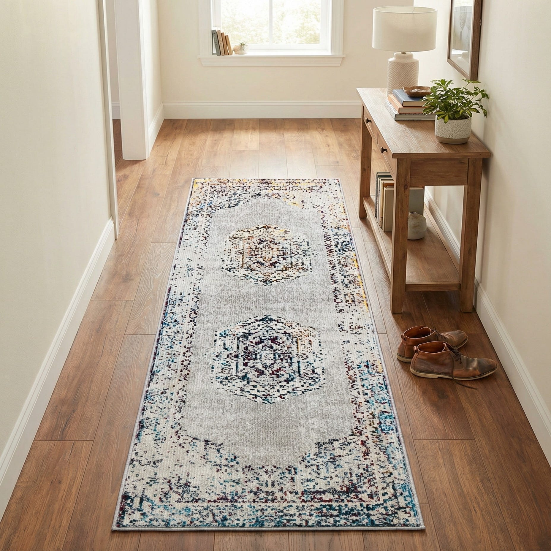 This runner works well in a narrow entryway or hallway, alongside a kitchen aisle, or placed at the foot of a bed to introduce color and subtle pattern. It pairs nicely with warm wood tones, light upholstery, and mixed-metal accents, and fits transitional, modern farmhouse, and eclectic interiors where a hint of vintage character and multicolor accents are desired.