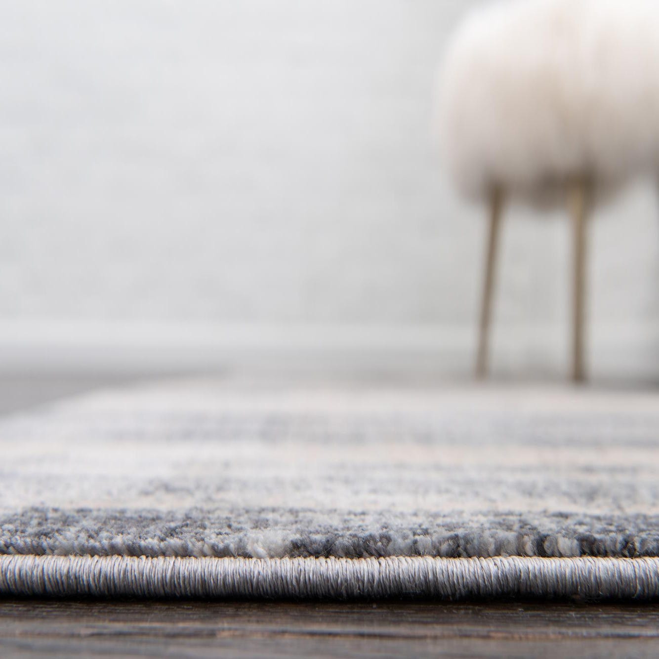 A soft linear pattern of horizontal striations gives this runner a calm, worn-in look: a cool gray background layered with warm beige and subtle light-blue accents that blend into a watercolor-like, slightly heathered surface. Machine-made from 100% polypropylene with space-dyed yarn, the low, even pile has a smooth hand and natural color variation that adds depth without heavy contrast.